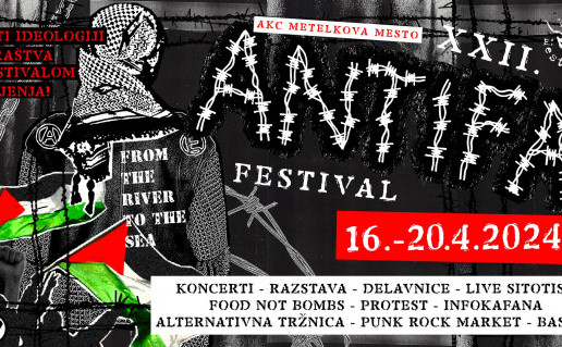 x 22. ANTIFA fest, ki poteka od 16. do 20. aprila na Metelkovi; izpostavljamo Infokafano Palestine Solidarity: Anti-Colonial and Jewish Perspectives v petek, 19. 4., ob 19.00 v a.infoshop