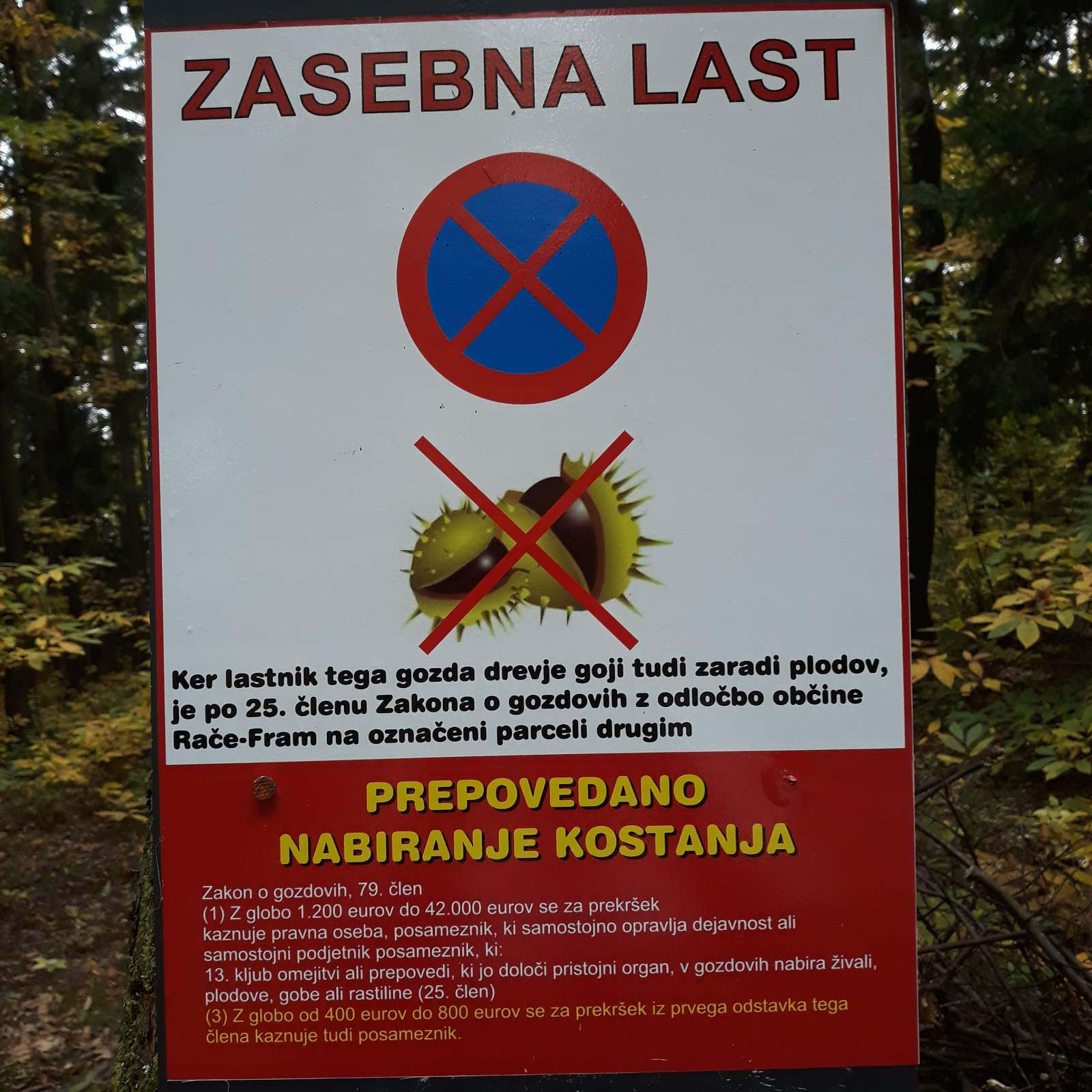V občini Rače – Fram ob Mariboru pa so se za razliko od primorskega primera, pri katerem so kostanje prepovedali nabirati le okoli posameznih dreves ali skupin dreves, odločili s trakom obdati kar celotne parcele dreves. Znaki o prepovedi nabiranja ter opozorila o videonadzoru so ponekod nabiti kar na drevesa, obenem pa so obkoličili še potencialna parkirna mesta ob dostopih v gozd.