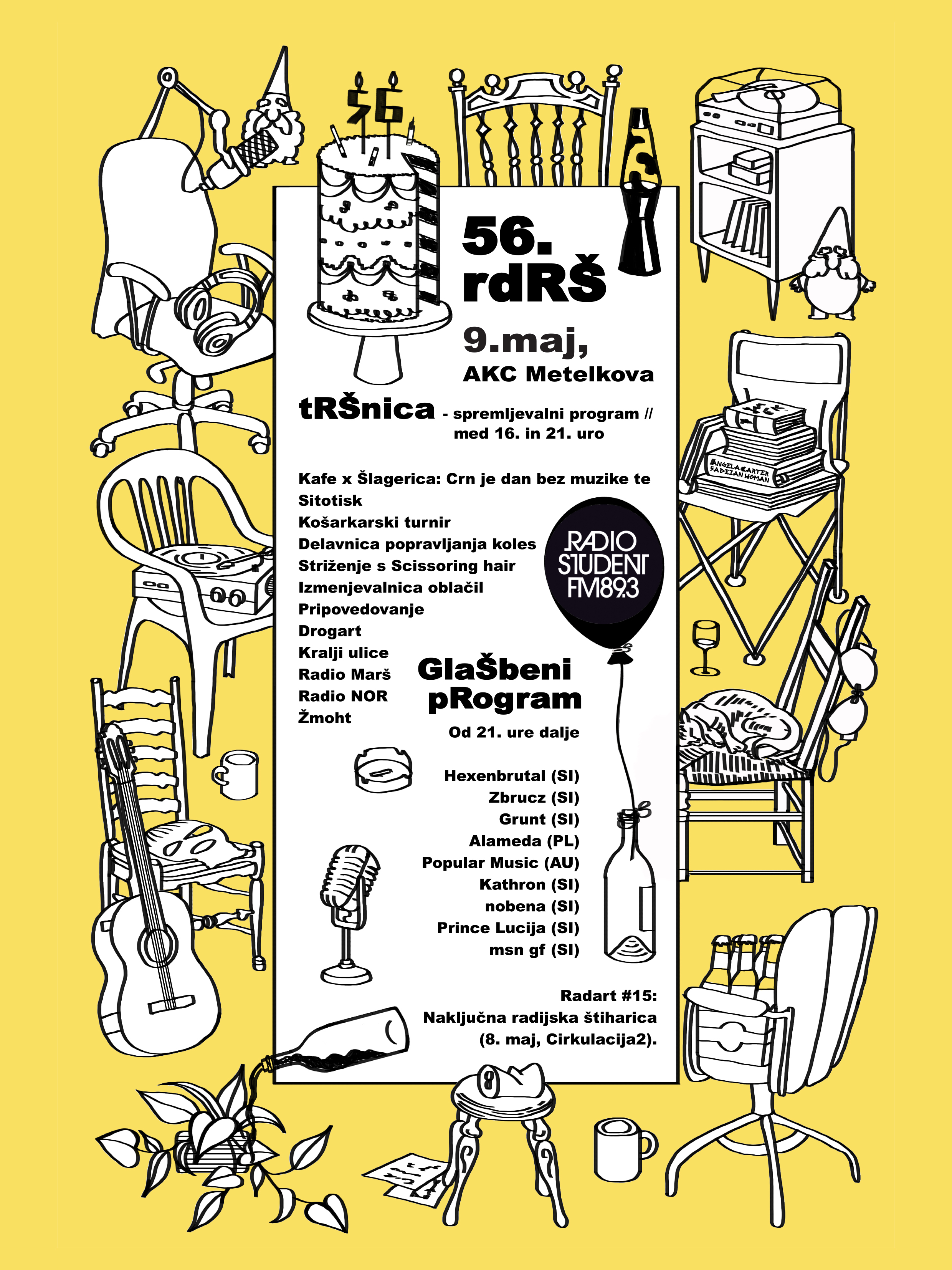 Po veliki noči in obveznem vstajenju od mrtvih se že obeta tudi vsakoletno praznovanje rojstnega dne Radia Študent. Kot vedno bomo 9. maja slovesno in slavnostno obeležili svojo obletnico ‒ ampak brez skrbi, tokrat bo 56. letom primerno vse skupaj malo bolj … neformalno. Pridružite se nam torej v petek, 9. maja, na Metelkovi (frak in cilinder ‒ opcijsko, vabilo velja za vse osebe, dobra volja je neobvezna), več pa v nadaljevanju.
