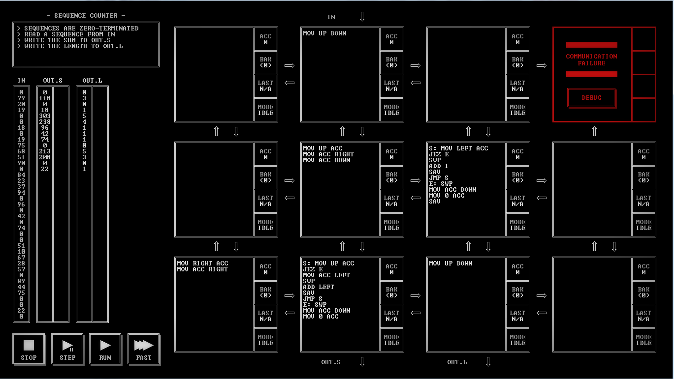 Posamezniki s kančkom teoretičnega računalniškega znanja bodo hitro dognali, da arhitektura sistema v igri zaradi potreb same mehanike ugank ni niti praktična niti realistična. A če zamižite na eno oko, boste z drugim zagledali prav simpatičen računalnik, ki ni holivudsko poneumljen in bi svoji okornosti navkljub morda lahko prav zares obstajal v zaprašenih omarah kake akademske ustanove. Programirate ga s podobno realističnim zbirnim jezikom, ukazi katerega so zgledno dokumentirani v prej omenjenih navodilih, pri čemer reševanje tehničnih zagonetk ni vaš edini cilj. V vsaki stopnji se namreč pojavijo tudi okvarjeni moduli, ki jih ne morete uporabiti za reševanje, je pa vaš stric vanje shranil pomembne informacije o misterioznem računalniku. Postopno odklepanje koščkov zgodbe tako motivira k reševanju novih ugank, skupaj s statističnim izpljunkom vašega uspeha. Ob vsaki zaključeni nalogi so vam namreč predočeni grafi, kjer lahko kvaliteto svoje rešitve po času izvedbe in količini ukazov primerjate z umotvori drugih hobi programerjev in po želji tudi izvozite posnetek lastnega uspeha na jutub. Oba mehanizma sta vam dobro znana, ako ste igrali Infinifactory ali SpaceChem - starejša naslova istega avtorja Zachtronics. Drugega smo, mimogrede, prežvečili v eni izmed prejšnjih epizod Pritiskavca.