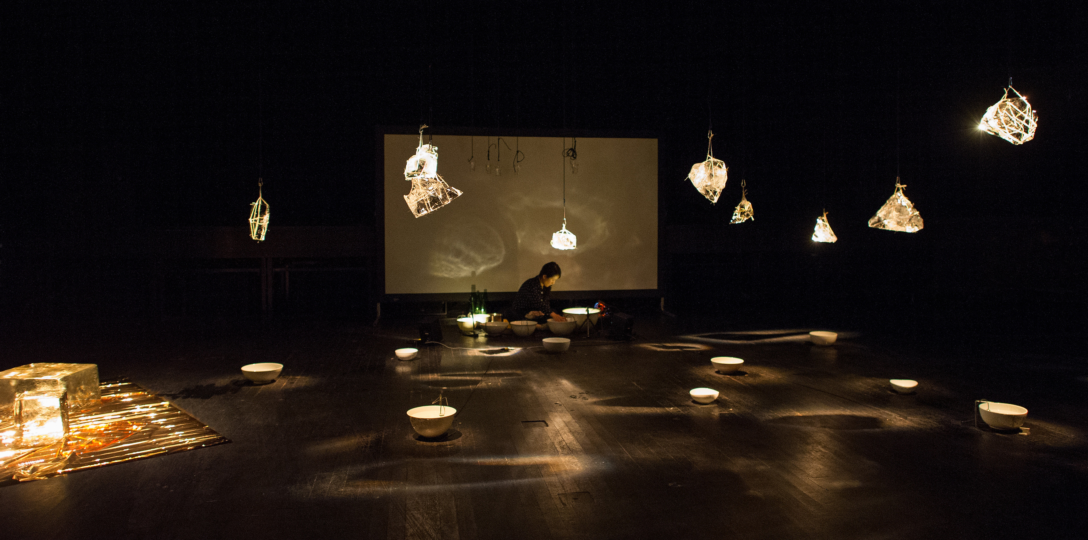 Tomoko Sauvage- kompozicije, porcelanaste skledice, voda, hidrofonični mikrofoni, povratna zanka, ...;;