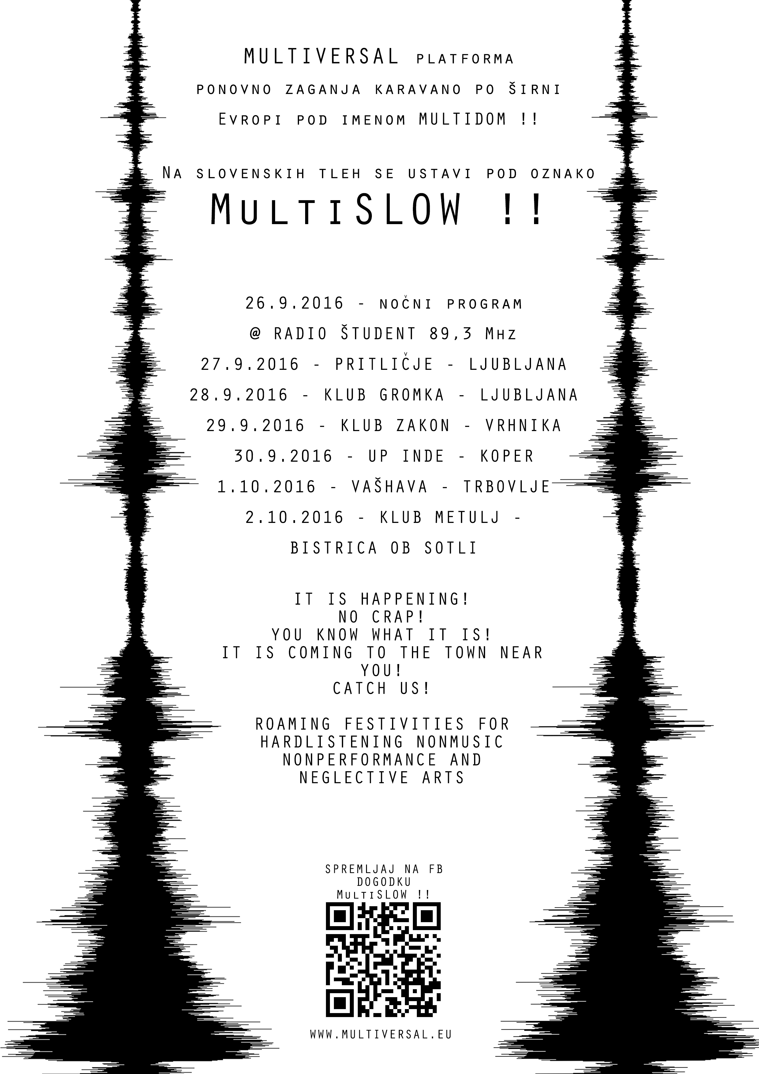 Na tokratnem drugem festivalu MULTISLOW !! se ponovno priključujemo multiverzalni karavani, ki že dobrih pet let s kreativno okupacijo zaseda velemesta po vsej Evropi in s tem ustvarja priložnosti za ljubitelje ekstremnih godb. Deluje pod krovnim imenom Multiversal, ter se preoblikuje v neštete derivate skozi različne teritorije in vse to zaradi nekaj entuziastov in s pomočjo D.I.Y. etike. Po lanskoletni prvi slovenski trodnevni ediciji karavane Multiversal, smo letos na domačih tleh poskrbeli za obilno ponudbo in sedem dni trajajoče rajanje, vse od nočnega programa na Radiu Študent do skrajnih kotičkov in klubov, ki predstavljajo srčiko domačega untergrunta.