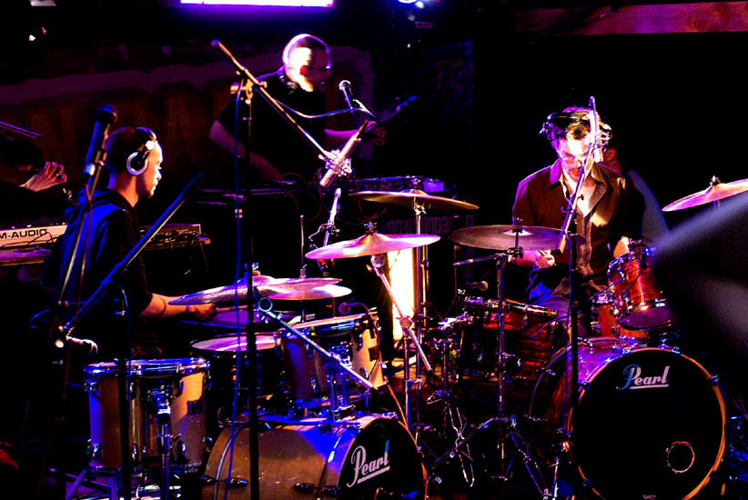Kot zadnji četrtkovega večera pa so Katedralo okupirali škotski Hidden Orchestra, vedno bolj popularna zasedba, ki je v programski sklop letošnjega jazz festivala vnesla novo skrajnost hoje po robu jazzovskih izročil. Že če je jazz primarno v živo izvajana glasba, lahko tu ob izvajanju Hidden Orchestra postavimo vprašaj. S slušalkami opremljeni glasbeniki namreč igrajo na konkretno dolge in ne-gibke podlage, ki predstavljajo bistven del njihovega zvoka. V spremljavo jim gode dvojec z metronomom sinhroniziranih bobnarjev. Na ta način v nekem delnem smislu poustvarjajo vzdušje DJ-seta, v melodično gradnjo pa se spuščajo z najpogosteje močno reverbiranimi eteričnimi linijami violin, zvokov klaviatur ter pihal. Izraz, ki ga tako gradijo, je očitno ljub velikemu delu publik, nenazadnje smo podobne koncepte že imeli priložnost poslušati na velikih ljubljanskih festivalskih odrih v preteklih letih. Basist in vodja zasedbe Joe Acheson s svojimi premišljenimi linijami vedno uspe v izgradnji preprostega groova, temu primerne harmonsko ravne kompozicije pa se gibljejo med svetovi bolj obrobnih plesnih muzik, sodobnih fusion konglomeratov in urbane sredinskosti. Najbližja primerjava izrazu Hidden Orchestra v nekoliko širšem smislu, kot le v primerjanju zvočnosti, so hrvaški Bilk, četudi je glasba slednjih nekoliko manj rigidna. Je pa smer, ki jo izbirajo Hidden Orchestra, gotovo tržno bolj perspektivna, kot recimo smer drugega dela sodobne jazz fusion ali jazz electronica godbe, katere tipični predstavniki bi bili denimo Jaga Jazzist, bend ki gotovo koraka bolj pustolovsko skozi odprto področje mešanja principov elektronskih muzik ter inštrumentalnih zasedb. To je zelo očitno tudi v njihovem živem nastopu. Brez slušalk.