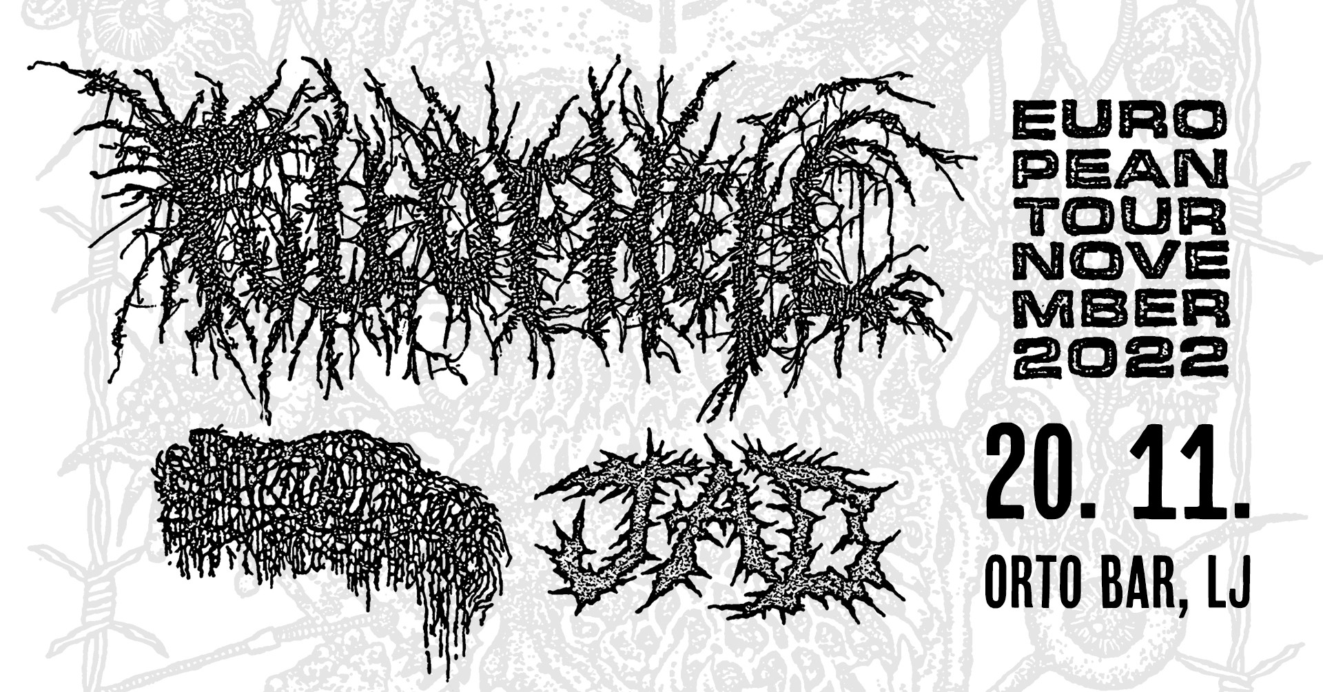 Evropske turneje večinoma ameriških karavan so postale objekt lahkotnega posmeha. Čestokrat se vsaj v teoriji veselimo nam bližjega obiska imen velikanov čezatlantske glasbe, dokler naše sanje ne izzvenijo v puhlem zavedanju, da v svoje razumevanje turneje po Evropi glasbeniki vključujejo denimo dva datuma v Nemčiji in enega v Franciji, ker je lih usput na poti k neizogibnemu zaključku turneje v Veliki Britaniji. Ko so pred dobrimi štirinajstimi tedni haranje po Evropi naznanili kultni krotilci hrupa in grinda, Full of Hell, so bili občutki podobni. Prekrižanih prstov smo premišljevali o bencinu prijaznem datumu nekje v srednji Evropi: »Mogoče Gradec, tam scena hara, joj, sam ne nekje na severu, k si še šotora ne morm prvoščit, če bo treba, grem tut v Zagreb«. Ampak k sreči nam tega ni bilo treba. Po dobrih devetih letih so namreč naš lokalni brlog zla ponovno obiskali grind mogotci Full of Hell, tokrat ob spremljavi death brutalcev Sanguisugabogg in poljskih hardkorašev Jad.