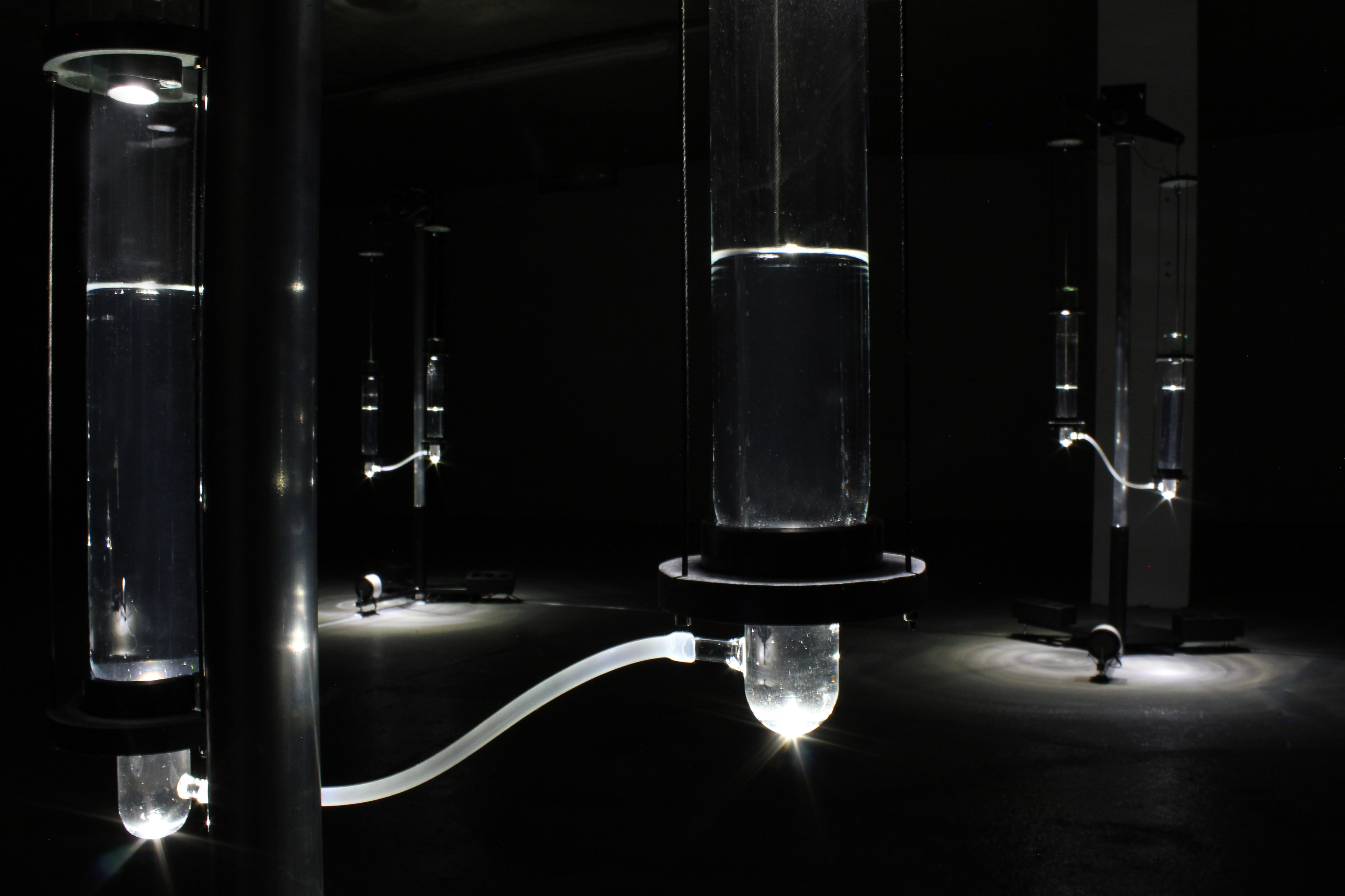 Nahajam se v zatemnjenem prostoru prekarnih ravnovesij in povezav, temnem trebuhu lovkastega organizma z ulice malo prej. Prisotna je voda, napeljave, spoji, cevke, dvižni mehanizmi in drugačne vrste organi – oddajniki in receptorji, hranilci in použivalci, mikrofoni in zvočniki, izmenjaje se. Tipping Point avtorice Kathy Hinde ni najenostavnejši, vendar tudi ne najkompleksnejši možni sistem. Kot vse, kar nas tako zadane, stoji na relativno primarnih komponentah, količinah in sprožanjih. Tu je osem enot, na katerih so v nekakšne povečane epruvete postavljeni mikrofoni, ki občujejo z majhnim zvočnikom na dnu vsakega stojala. Epruveti sta na vsaki enoti dve, napolnjeni z vodo, na dnu pa sta povezani s cevko. Epruveti dviga in spušča mehanizem, s katerim upravlja skriti računalnik po neke vrste naključnostnem izračunu. Dviganje in spuščanje seveda spreminja količino vode v vsaki epruveti, tekočina neizogibno počne to, kar tekočina počne. Enote se vklapljajo in izklapljajo, oglašajo se ločeno, skupaj in po vseh drugih možnih kombinacijah. Zvočna nit, ki vse to nosi, polni prostor, odstira in vleče k sebi v naselitev, pa je splet osnovne mikrofonije, ki se odziva na konstantno spreminjajočo se razdaljo med mikrofonom in zvočnikom ter spremembo nivoja vode v vsaki posamezni epruveti, resonančni komori, ki je bivališče vsakega posameznega mikrofona.