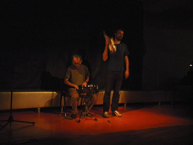 Še pred Cordierjevim zaključkom torkovega večera pa sta Kiberpipo, s klimatsko napravo vred, prežela in uspešno iztrošila Jean-Luc Guionnet in Seijiro Murayama. Lani smo na Radiu Slovenija že poslušali njun duo nastop. V primerjavi torkovega koncerta s tem lanskim predvsem izstopa razlika med sterilnim zvočnim okoljem radijskega studia in okoljem z glasno prisotnostjo mehaničnih delov še sam ne vem katerih naprav, kakršen je prostor Kiberpipe. Glasbene metode Seijira Murayame so v odnosu do tišine in muzikalnosti, ki ju gojijo, verjetno kar dominantne, ko gre za ta duet. Njegovo redko udarjanje po snare bobnu je bilo tisto, ki je prostoru dalo zazveneti, Guionnet pa je s svojim igranjem pretežno vpadal v isti nastavljeni prostor, v katerega je vpadalo tudi okoljsko šumenje, ki je za-dobilo povsem muzikalne kvalitete. In to v kontekstu, katerega muzikalnost je bila izzvana.