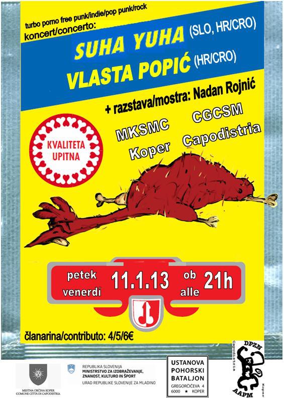 Pred koncertom je bila odprta še majhna razstava Nadana Rojnića, ki pa je bila nekakšna zbirka majhnih skic. Nadan je pred leti redno oblikoval plakate koprskega mladinskega centra in prav večina teh plakatov krasi zidove predprostora mladinskega centra. Prvi nastopajoči so bili Suha Yuha, skupina je sestavljena iz treh članov, ki pa so v bistvu stari mački, saj so ali pa preigravajo v bendih, kot so Žambo Žoet Workestrao, Kud Idioti in Gori Ussi Winnetou. V samem začetku je vse skupaj delovalo zmedeno, saj nisi mogel takoj dojeti bistva benda. Pri Suhi Yuhi gre za nekakšno eksperimentalno zmes punka, free-jazza in improviziranega hrupa, to pa je vse skupaj vrhunsko zmešano. Bobnar je bil glavna atrakcija v bendu, saj je on najbolj tehnično izstopal. Njegove spretnosti so ti prav vzele pozornost in si pozabil na kitaro in bas, ki sta postala le hrup v ozadju. Malo je bilo momentov, ko je iz celote izstopila kitara in še manjkrat se je to zgodilo basistu. Kljub temu, da sta kitarist in basist vrhunsko odigrala svoj del, je bilo pač bobnanje res izjemno. Bend je v živo zelo dinamičen in nepredvidljiv, tako so lahko iz nekakšne jazzerske improvizacije preskočili v hitri in hrupni punk ali pa zadevo umirili in ustvarili popolnoma temačno vzdušje. Žanrski preskoki so bili nenadni in prav to je bil razlog, da je vse skupaj delovalo zanimivo in klicalo po pozornosti. Njihov nastop je trajal približno pol ure, kar pa je popolnoma zadoščalo. Več bi bilo preveč.