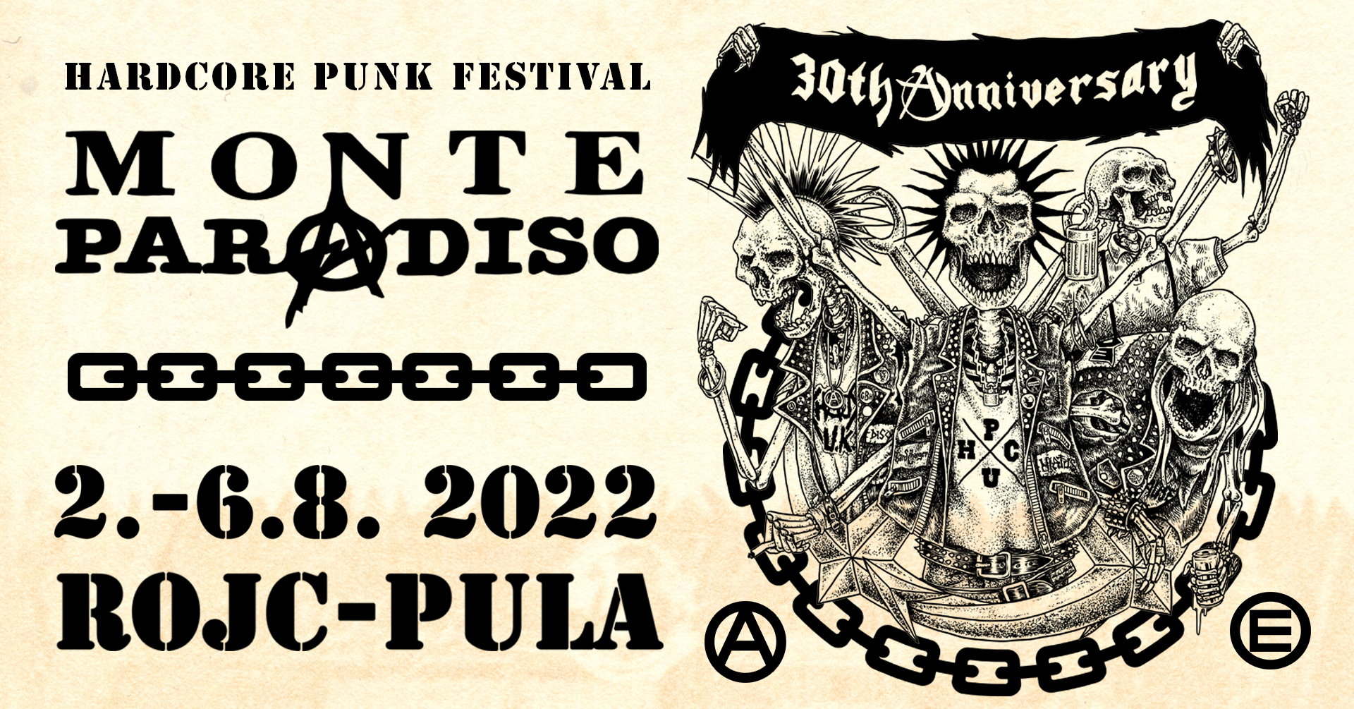 (sobota) 6. 8. Pula, Rojc – 30. Monte Paradiso Festival: Agregat (slo), Bronze (srb), Bait (e), Statico (srb), Scheisse minelli (d), Asocial (swe).