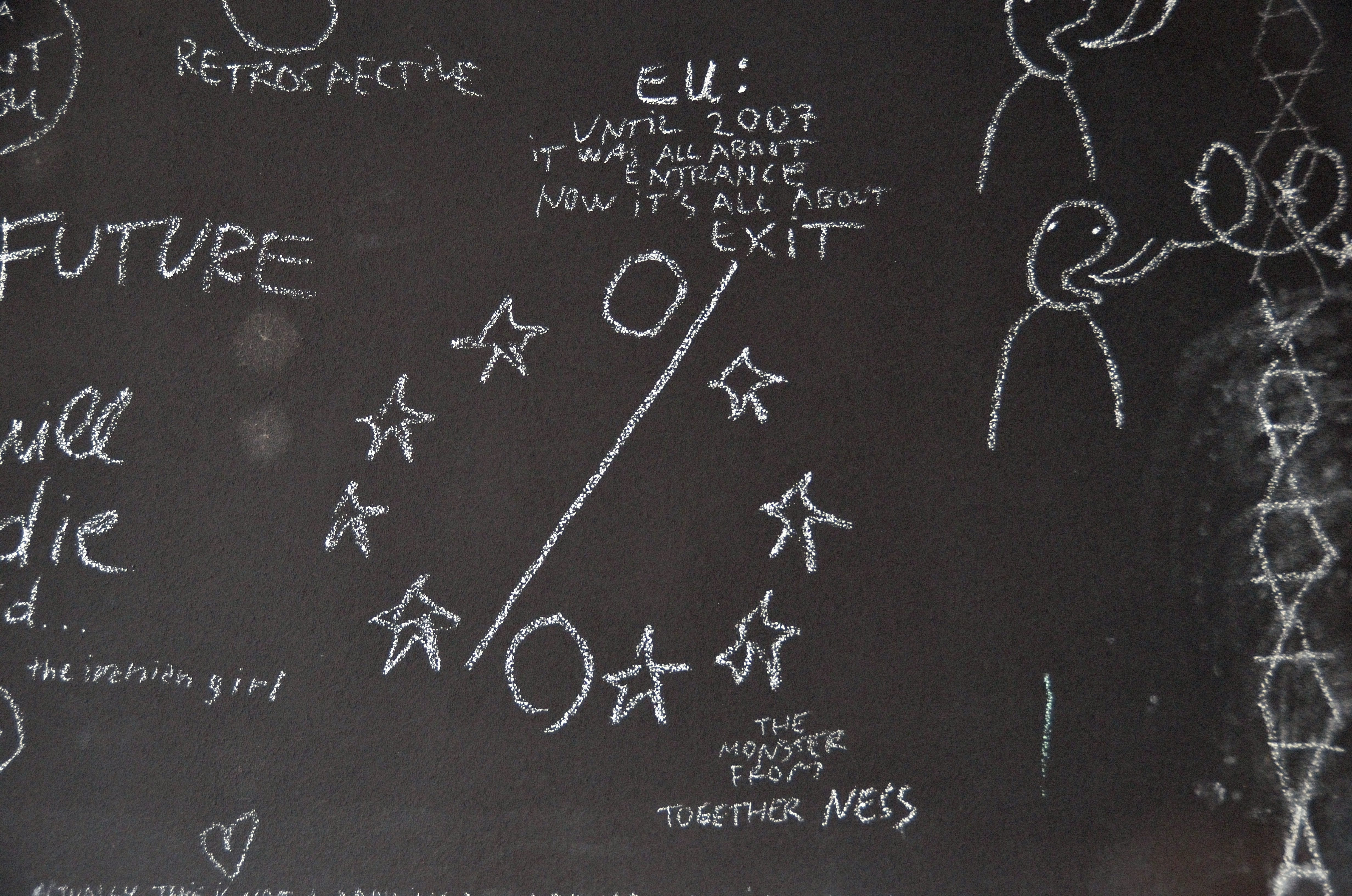 Podobno opozorilno vrednost imajo besede tudi v delih romunskega umetniškega para Dana in Lie Perjovschi. Par sicer deluje ločeno, vendar sta si njuni praksi med seboj zelo podobni. Oba k ustvarjanju umetnosti pristopata raziskovalno, vsak pa raziskane teme predstavi na sebi lasten način. Lia Perjovschi v svoje delo vključuje predvsem različna besedila – njeno delo je izjemno eklektično, različne teme in z njimi povezana besedila sestavlja v obširne miselne vzorce, v katerih vizualno poveže svoje misli. Primere njenega dela imamo tudi v pol-stalni zbirki Cukrarne. Njena praksa pa originalno izvira iz izkušnje življenja pod diktatorskim režimom Ceausesca, ko je bilo o določenih temah prepovedano pisati. Vizualni prikaz tem in njihove medsebojne povezanosti ji je po romunski revoluciji leta 1989 pomagal ozavestiti intelektualno podstat, ki predhodno ni bila dostopna.