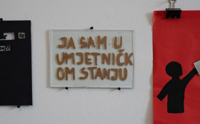 Zlate črke na steklu: JAZ SEM V UMETNIŠKEM STANJU.