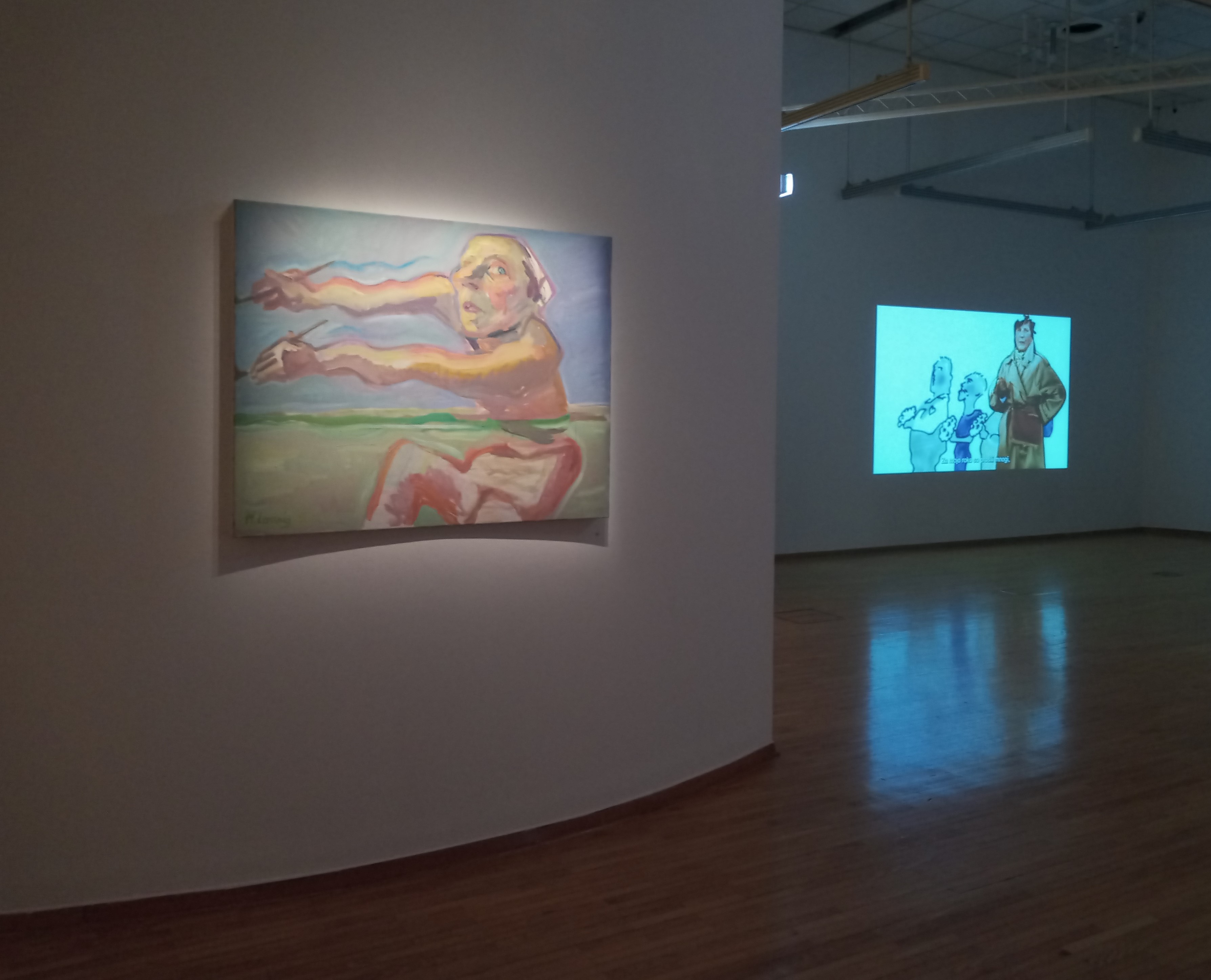 Prav avtoportreti so sicer motiv večine umetničinih slik, na razstavi pa je predstavljen en sam. Poleg njega so na ogled tri slike, ki so tudi same bolj risarske. Ozadja so neobdelana, poudarek pa je na ekspresivnih linijah, ki bodisi tečejo z ene strani platna na drugega v kaotičnih snopih bodisi povezujejo gmote mesenih barv; na videz nekje med telesi in rožnimi cvetovi. Tematsko se te slike res skladajo z razstavo, ki središči risbo, temelječo na telesnih občutkih. Vendar pa same po sebi mejijo na preveč dobesedno metaforiko. Za razliko od risb namreč namesto, da bi delovale kot odvod avtoričinega občutja, linije neposredno odslikujejo odnose med posamezniki, ki jih glede na grobi videz slik verjetno doživlja kot boleče. V kontekstu razstave pa morda vseeno služijo kot najočitnejša povezava med psihološkim in fizičnim, ki sta v opusu Lassnig neposredno prepletena. Barva, ki je v risbah praktično povsem odsotna, pripomore k bolj visceralnemu doživetju podob. So pa slike tudi edina dela na razstavi, opremljena z lastnim besedilom, ki jih na kratko interpretira. Preostali tekst na razstavi – in tega ni malo – je predvsem biografski.