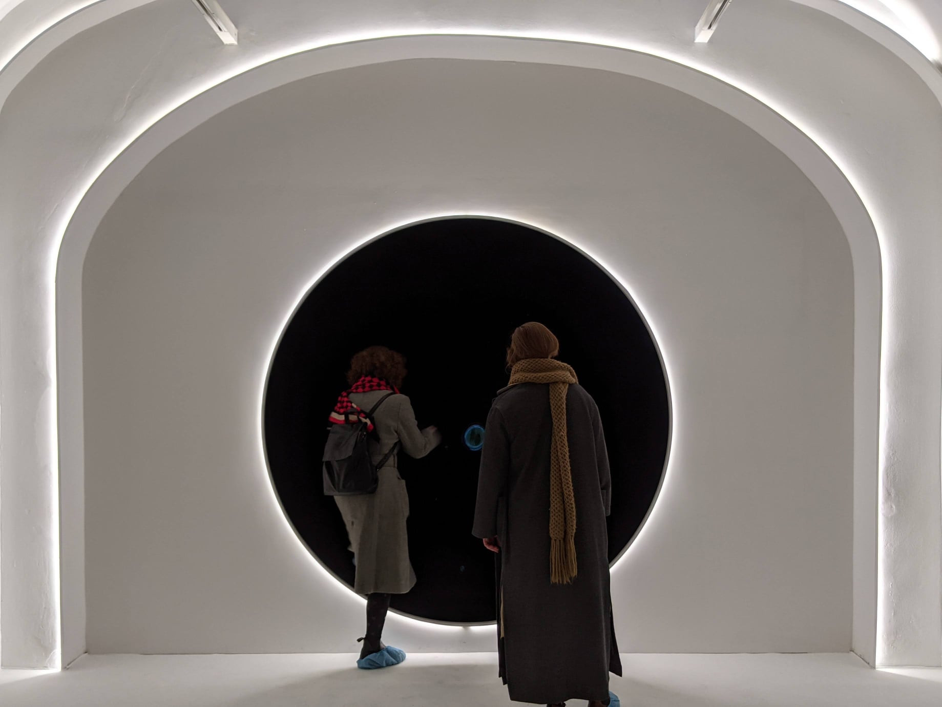 Ko se naveličamo zrenja lastnega odseva v ogromnem mehurčku, ki je vmes že nekajkrat počil in se na novo vzpostavil, se odpravimo nazaj v vežo in od tod še v drugo sobo. Prostor je simetrično nasproten sosednjemu – sprva vstopimo v popolnoma bel prostor. LED-lučke so skrite za obodom arhitekturno in z luknjo poudarjenega vhoda v črno jamo, v katero moramo vstopiti. Nismo povsem prepričani, kaj nas tam lahko čaka. Okrogle odprtine tokrat ne prekriva milnica, pa vendar prava mera previdnosti pred vstopom v črno jamo ni nikoli odveč. Z nekoliko obotavljanja le vstopimo v temačen prostor. Ko že nekaj časa stojimo v temi in gledamo v svetli del prostora, se sproži stroj, ki začne v nas pihati mehurčke različnih velikosti. V množici malih sfer lahko vidimo svoj pomanjšan odsev, če pa kateri izmed mehurčkov ubeži na drugo stran okrogle odprtine, uzremo zgolj odsev bele LED-svetlobe, ki oblikuje sferično mavrico na majhnih in malo večjih kroglah.