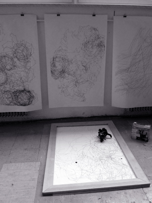 Temu elementarnemu spoznanju sledi logični korak nastanka performativne umetnosti, ki v samo središče pozornosti postavlja ravno prej omenjene procese umetniškega ustvarjanja. Bolj natančno, tokrat obravnavamo novo performativno risbo, ki je predmet razstave v Centru in Galeriji P74 v Ljubljani. Razstava, ki je hkrati tudi instalacija, sliši na ime Umetnost bombardiranja, ogledate si jo pa lahko do 20. marca. Naslov projekta, kot pravijo avtorji, izhaja iz grafitarskega slenga in pomeni popolno pokrivanje površine z grafitom ali tagom.