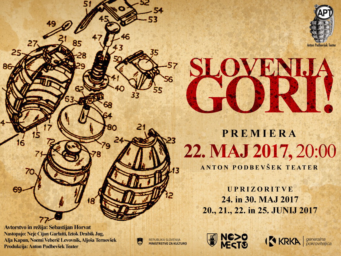 Malo bolj južno, v prestolnici Dolenjske, na nadmorski višini 202 metrov sredi gričevnate pokrajine v rečnem zavoju reke Krke pa se v Anton Podbevšek teatru ob osmi uri premierno uprizarja avtorski projekt z naslovom Slovenija gori. Sebastjan Horvat, v režijski in avtorski funkciji, je projekt posvetil stoti obletnici oktobrske revolucije. V predstavi pa so uporabljeni tudi motivi iz romana Sence ne gorijo Erika Valenčiča. V opisu koncepta se bo lahko spremljala zgodba petih posameznikov, ki so: »zbrali vse zgodbe ponižanj, sistematskega prezira, osebnega gnusa družbene tesnobe. Organizirano zbiranje jih ne zanima, prerasli so aktivizem, bedne ideje o političnem udejstvovanju, duši jih obstoječe stanje. Njihove reforme niso nikakršne bele knjige, študije, elaborati, programi ali trajnostni razvoj. Imajo eno samo rešitev. Iz garaže se zapeljejo v garažo, odprejo vrata pekla, katerih plamen objame vse in za seboj ne pusti nič razen sivega pepela.«