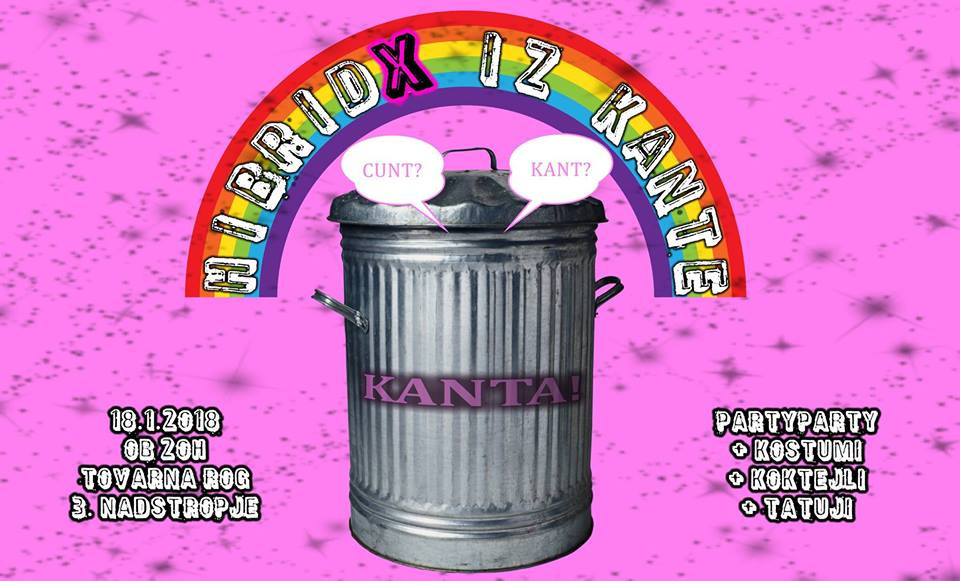 Današnja zabava HibridX iz KANTe, ki tudi naznanja otvoritev novega kvir-feminističnega prostora v Rogu, pa poskuša iti vsaj par korakov dlje. Zakaj bi le izvrgli izmečke, ko pa jih lahko preobrazimo. Na zabavi se bomo s skupnim preoblačenjem v hibridke ali hibride iz kante šle menjavo identitet, levitve, množične cepitve. V tej krosbreeding utopiji, lahko zadanemo tudi ob kakšnega kiborga.