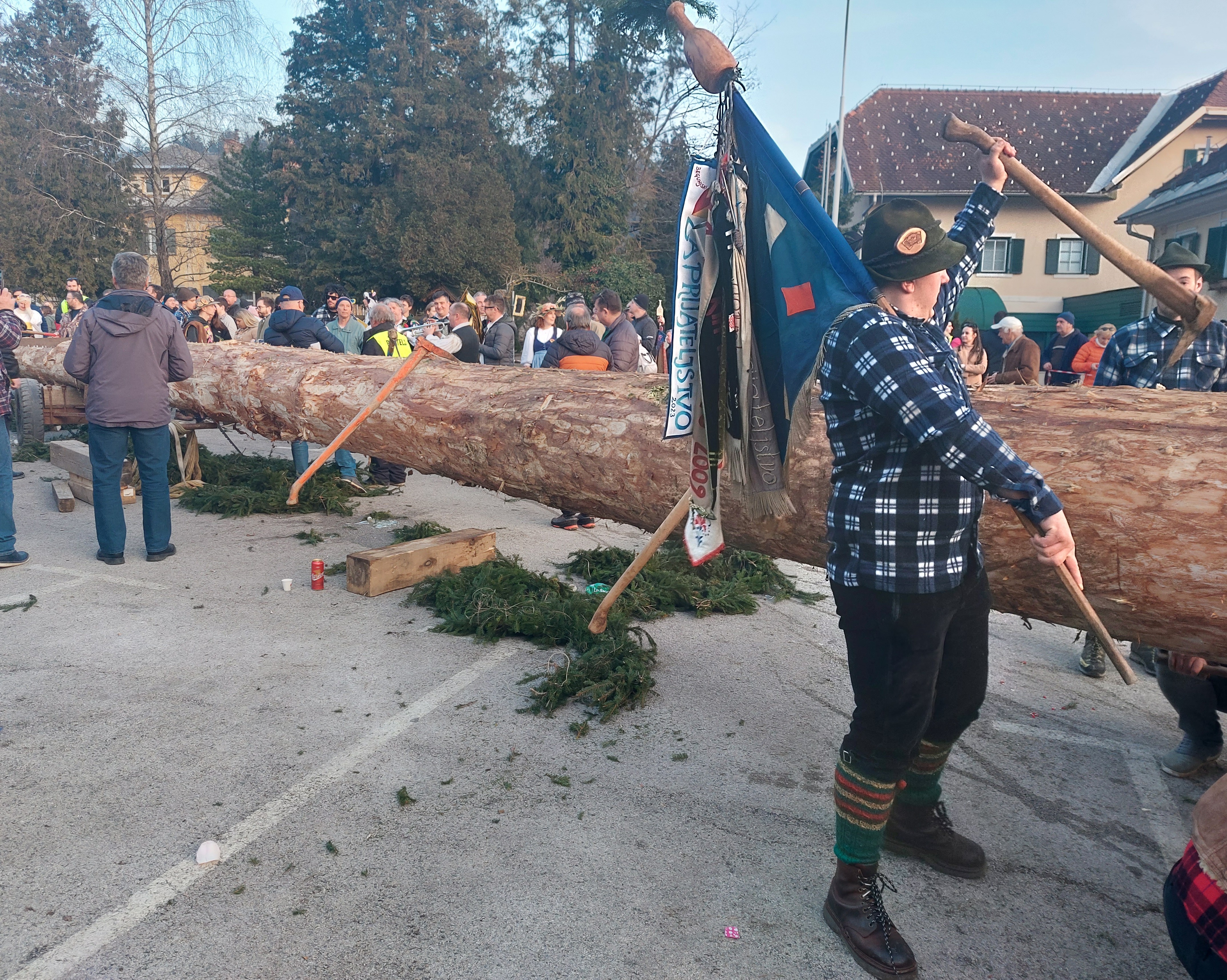 Ploh seveda ni polh, temveč deblo, drvo, hlod, skratka. Medtem ko smo reševali konceptualne nesporazume, se je na polju zbralo že lepo število zamaskiranih in dobrovoljnih domačinov, ki so prav tako kot mi pričakovali prihod zvezde popoldneva: ploha.