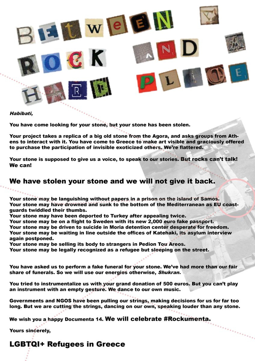 In za konec, ker sumimo, da novica še ni pokukala v tukajšnje prostore javnega mišljenja in artikulacije: na razstavi Documenta 14 v Atenah se je dogodil incident, ko so grassroot skupina LGBTQI ter nekaj prosilcev za azil v znak protesta ukradli kamen španskega umetnika Rogerja Bernata. Kamen je sicer poceni replika lithosa atenske Agore in naj bi ga različne skupine in kolektivi v okviru njegovega umetniškega projekta performativno-pogrebno ponesle iz Aten v nemški Kassel. Skratka, aktivisti so kamen spizdili in izjavili: »Vaš kamen naj bi nam dal glas in povedal našo zgodbo, ampak kamni ne govorijo. Mi pa.« Sedaj o tem v art-javnosti poteka kulturna debata, mi smo pa o tem podebatirali s Samerjem Arkawijem, v Ljubljani živečim študentom iz Damaska: