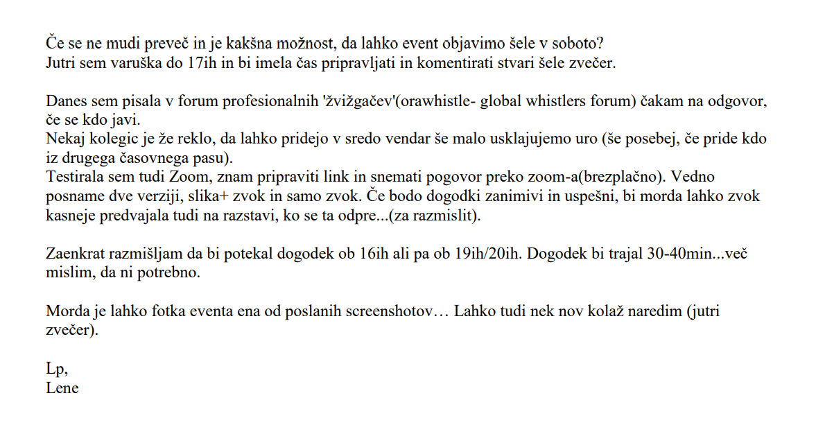 Ko so njena dela lahko znova naselila prostore odprte galerije, je Lekše ohranila nematerialni aspekt projekta in posnetek druženja žvižgačev zastavila kot samostojen projekt. Z zvočnim posnetkom žvižganja v času karantene pokaže enega izmed načinov premostitve osamljenosti in omejitve umetniškega izražanja, ko je oddaljenosti udeleženk navkljub uspela ustvariti skupnostni prostor. O komunikacijskem potencialu žvižganja nam več pove umetnica.