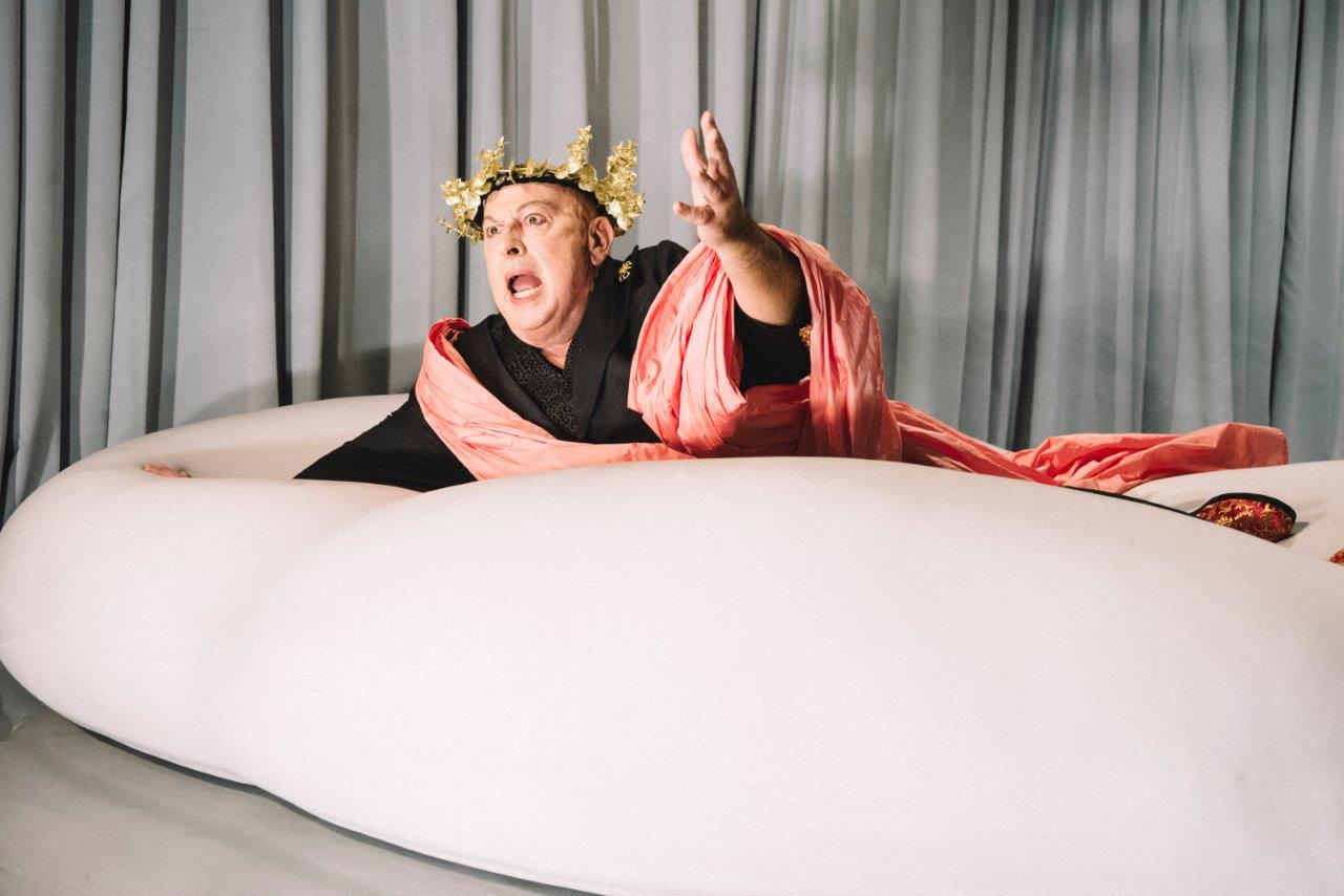 V dveh dejanjih, ki ju preči oster rez, a sta si v mnogih točkah zrcalna, Lazić vzporeja starorimsko kakistokracijo in proces nastanka gledališke predstave. Ljudje, ki trpijo despotovo zatiranje, so v obeh primerih potopljeni v topo stanje zamaknjenosti, podrejeni le najnizkotnejšim ali najsebičnejšim vzgibom. Dejanji povezuje prizor, v katerem Trimalhion svoje goste sili, naj pojejo »Na planincah luštno je«, potem pa se igralci začnejo spraševati o smiselnosti vključitve te pesmi v antični tekst, na kar na oder stopi še fiktivna režiserka, ki jo igra Daša Doberšek. Proces nastanka drugega dela predstave opiše igralec Klemen Kovačič.