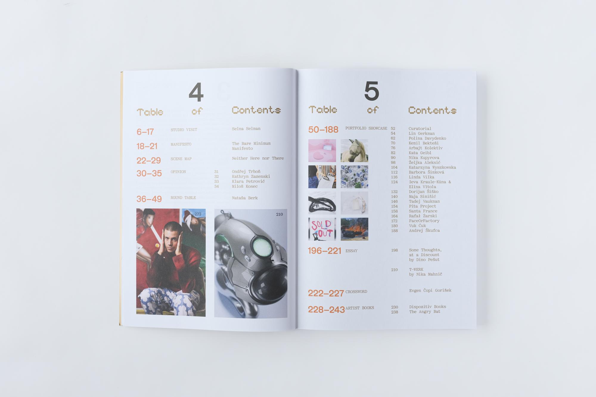 Zanimivo je, da ima poleg urednice in grafičnega oblikovalca revija tudi kuratorke. Predstavljamo si, da so zadolžene za izbor umetnic in projektov ter kontekstualizacijo slednjih v spremnih besedilih. Torej za delo, ki bi ga v revijah običajno enostavno pripisali urednici. Ena sicer ključnih vlog kuratork nasploh – umeščanje del v prostor – pa se v tisku preliva z vlogo grafičnega oblikovalca Zorana Pungerčarja. Prevladujočo estetiko, ki že od prve številke določa vizualno identiteto revije, lahko razumemo podobno kot kontekst razstavnega prostora. Skozi vse strani revije povezuje raznolike prispevke v koherentno celoto in narekuje kulturni oziroma estetski okvir, znotraj katerega revija obstaja.