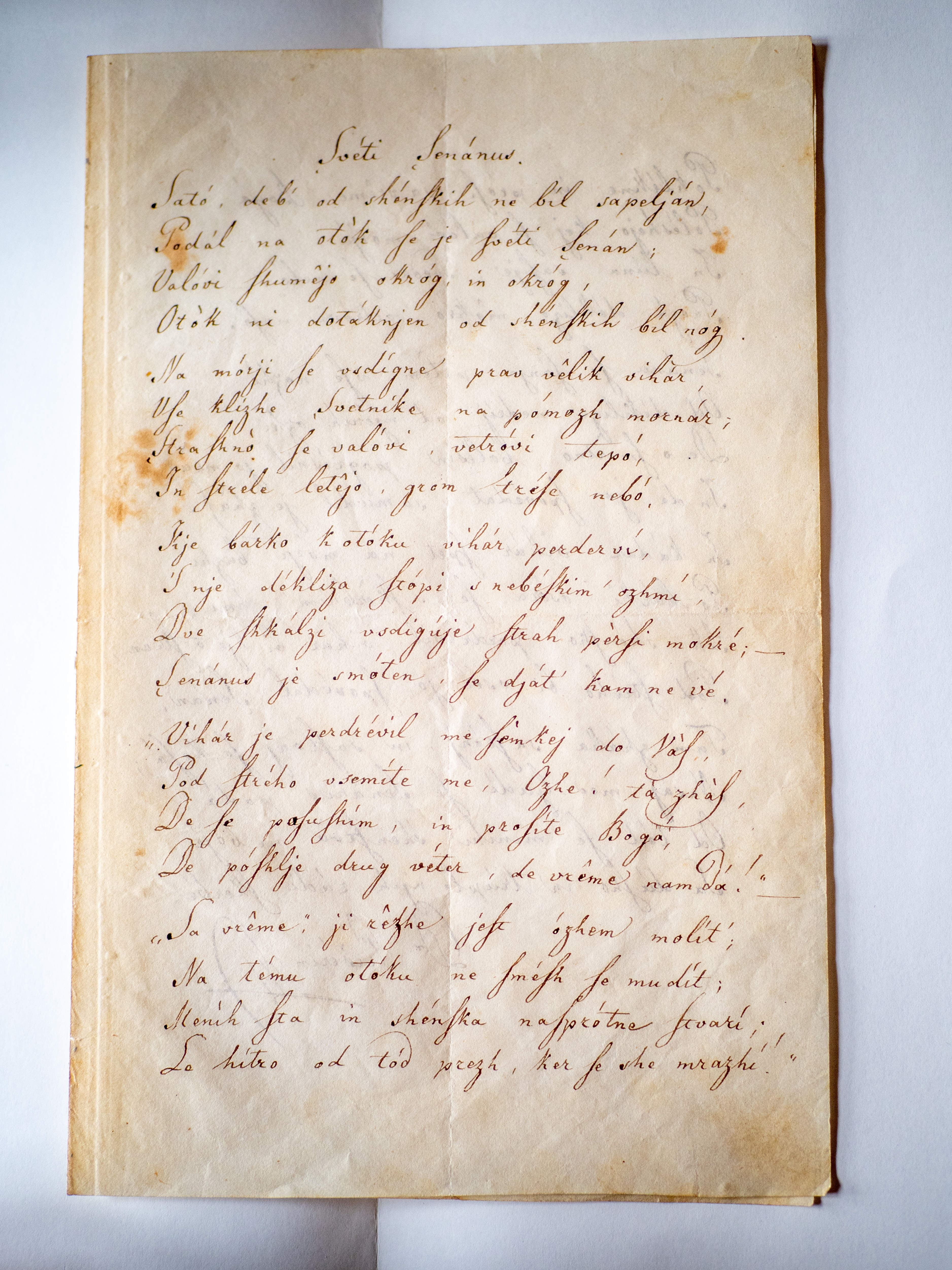 Druga velika pridobitev je izvirni Prešernov rokopis satirične pesnitve Sveti Senanus. Satirična meniška balada opisuje življenje meniha, ki odide na samotni otok, da bi ubežal skušnjavi. Ker skušnjavi tudi na otoku ne uspe ubežati, se menih naposled vrne med ljudi, kar naš pesnik pospremi z zbadljivkami na račun meništva. Kot poudari sogovornik, je za knjižnično zbirko NUK pomemben vsak drobec Prešernove zapuščine.