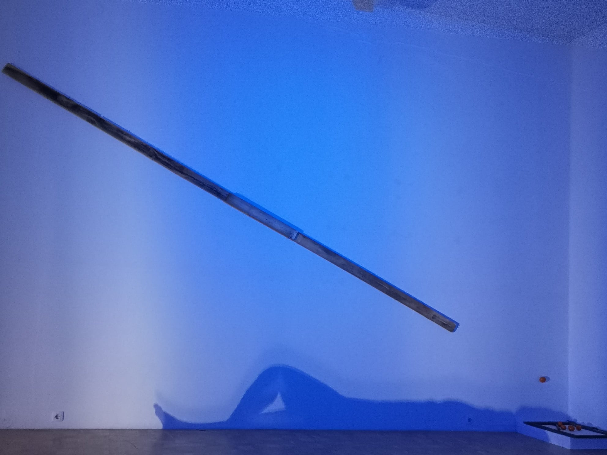 Prostor je po tleh diagonalno presekan z ozkim pasom belega peska. Ta pas se zrcali tudi v leseni kompoziciji na steni, ki predstavlja križ in je fokus trpečega plesa. Plesalka hodi in stoji na pesku kot materializaciji sence križa, ki povzroča čustveno trpljenje. V kotu stoji manjši kamen in tega Lorenci ob koncu predstave zamaje, da ob vedno hitrejšem vibriranju izzveni v tišino. Ob isti steni v drugem kotu pa stoji lesen okvir, ki ga plesalka med predstavo obesi na leseno figuro na steni. Pomen kompozicije in izbiro materialov opiše Lorenci.
