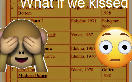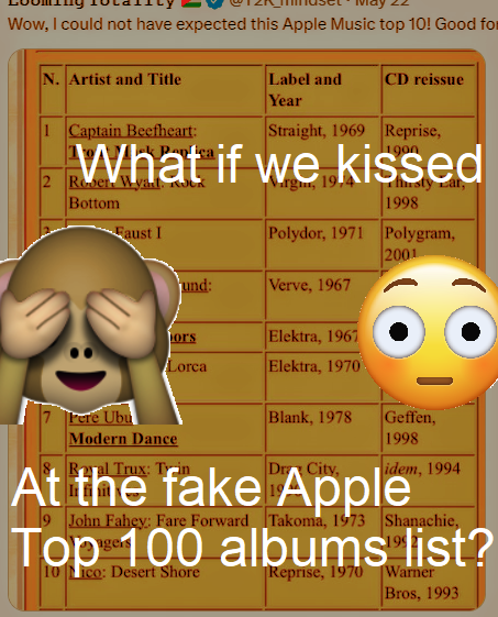 Ni pa nobenega dvoma, da bi omenjeni album našel mesto na razširjeni meme različici Apple lestvice, top ten katere lahko vidite na sliki. No, ali pač nekaj od GBV ... jaz, na primer, bi dal Vampire on Titus ... )