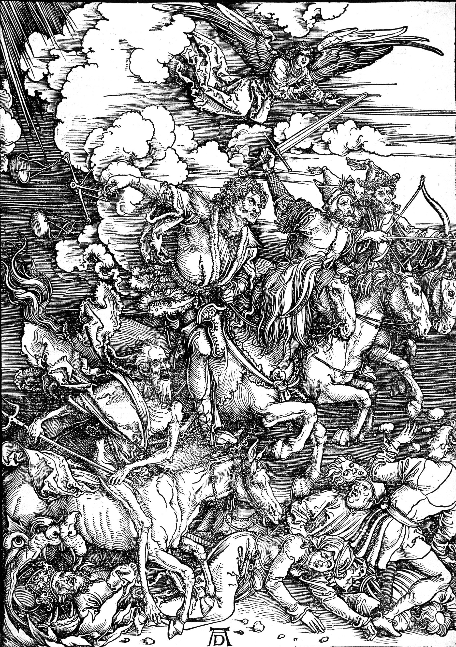 Zatrobil je peti angel: in videl sem zvezdo, ki je padla z neba na zemljo. Dan ji je bil ključ za žrelo brezna. Odprla je žrelo brezna in iz žrela se je vzdignil dim kakor dim iz velike peči. Od dima iz žrela sta potemnela sonce in ozračje. Iz dima so se usule na zemljo kobilice in dana jim je bila oblast, kakršno imajo škorpijoni na zemlji. Rečeno jim je bilo, naj na zemlji ne škodujejo ne travi ne zelenju ne drevju, ampak samo ljudem, ki so brez Božjega pečata na čelih. In ni jim bilo dano, da bi jih pobijale, ampak da so jih pet mesecev trpinčile. Njihovo trpinčenje pa je bilo kakor trpinčenje škorpijona, kadar piči človeka. V tistih dneh bodo ljudje iskali smrt, a je ne bodo našli; želeli bodo umreti, a smrt bo bežala od njih.