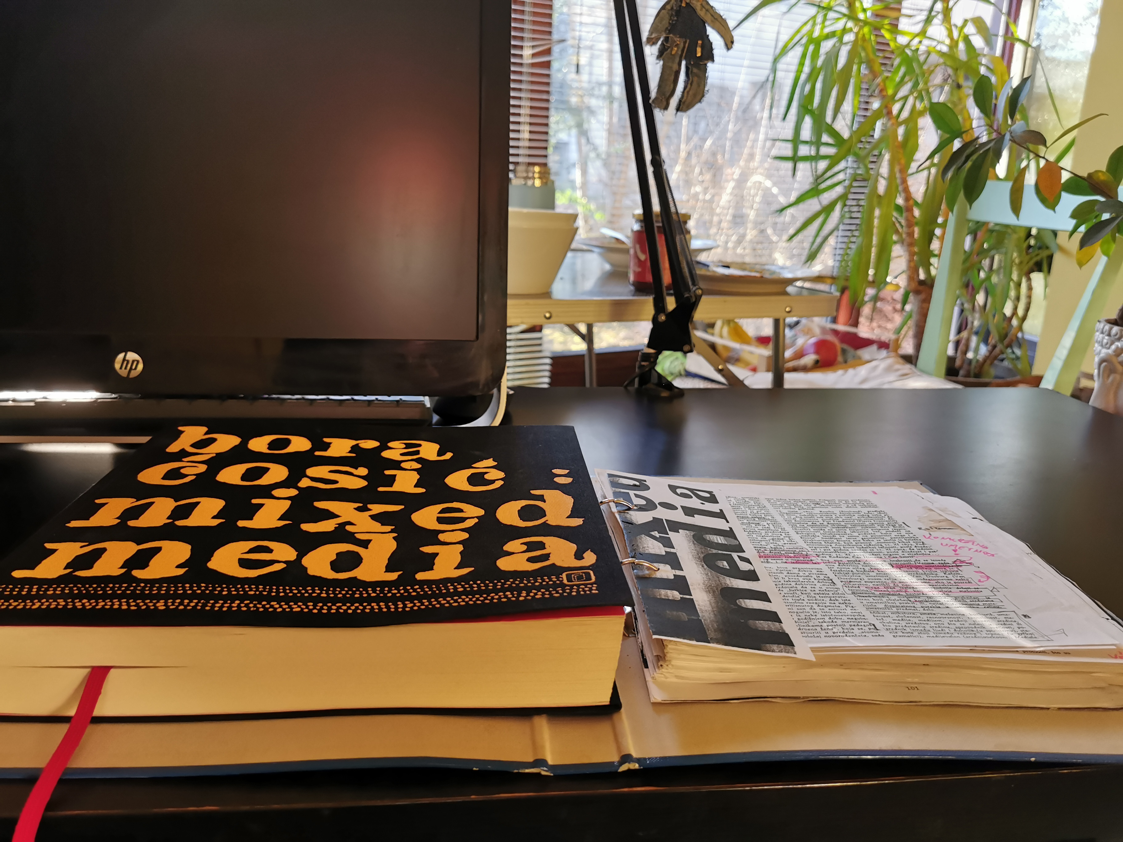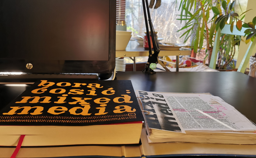 Na pisalni mizi mi leži lastnoročno fotokopiran izvod knjige Mixed media hrvaško-srbskega neoavantgardista in kasneje v Berlinu in Rovinju živečega pisatelja Bora Ćosića. Izvornik sem našel v NUK-ovem arhivu leta 2005 med pisanjem diplomske naloge o poeziji slovenskega neoavantgardnega gibanja OHO. Samizdat je bil na hrbtni strani zvezan kar z barvno vrvico. Fotokopirane strani sem štorasto obrezal in vtaknil v moder fascikel, ki je pred tem verjetno vseboval računovodsko papirologijo. Ob robovih strani se bohotijo nekakšne risbice, s katerimi sem si dvigoval razpoloženje med preddiplomsko melanholijo. Na mizi desno od modrega fascikla se bohoti nova izdaja Mixed media, izdana leta 2010 pri takratni beograjski izpostavi Založbe V.B.Z. – s početverjenim številom strani, črnimi platnenimi platnicami in naslovom, napisanim z ogromnimi črkami. Na tej točki vam bo, drago poslušalstvo, verjetno jasno, da moja z obema knjigama in ostalo pisarniško šaro nastlana miza sodi v kontekst mešanega medija, kot ga razume Ćosić. In da je moja uporaba avtobiografskih anekdot, v katerih naštevam to in ono, namerna, saj je to tudi metoda knjige, o kateri je govor. Ker je v knjigi tudi mnogo citatov, nadaljujemo s citatom iz knjige.