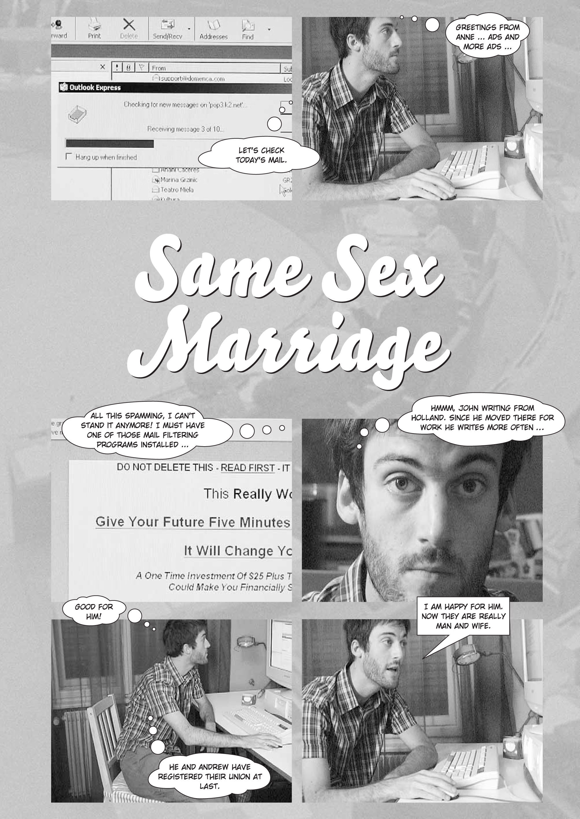 Valentina mi pošilja voščila ... Spet reklame! Sit sem že tega spama! Namestiti moram enega od programov za filtriranje pošte ... Oho, Jani se oglaša z Nizozemske. Odkar se je preselil tja zaradi službe, mi bolj pogosto piše ... Dobro! Registriral je zvezo z Andrejem. Vesel sem zanj. Zdaj sta kot mož in žena. Že dolgo sva prijatelja, a se mi vseeno zdi smešno.