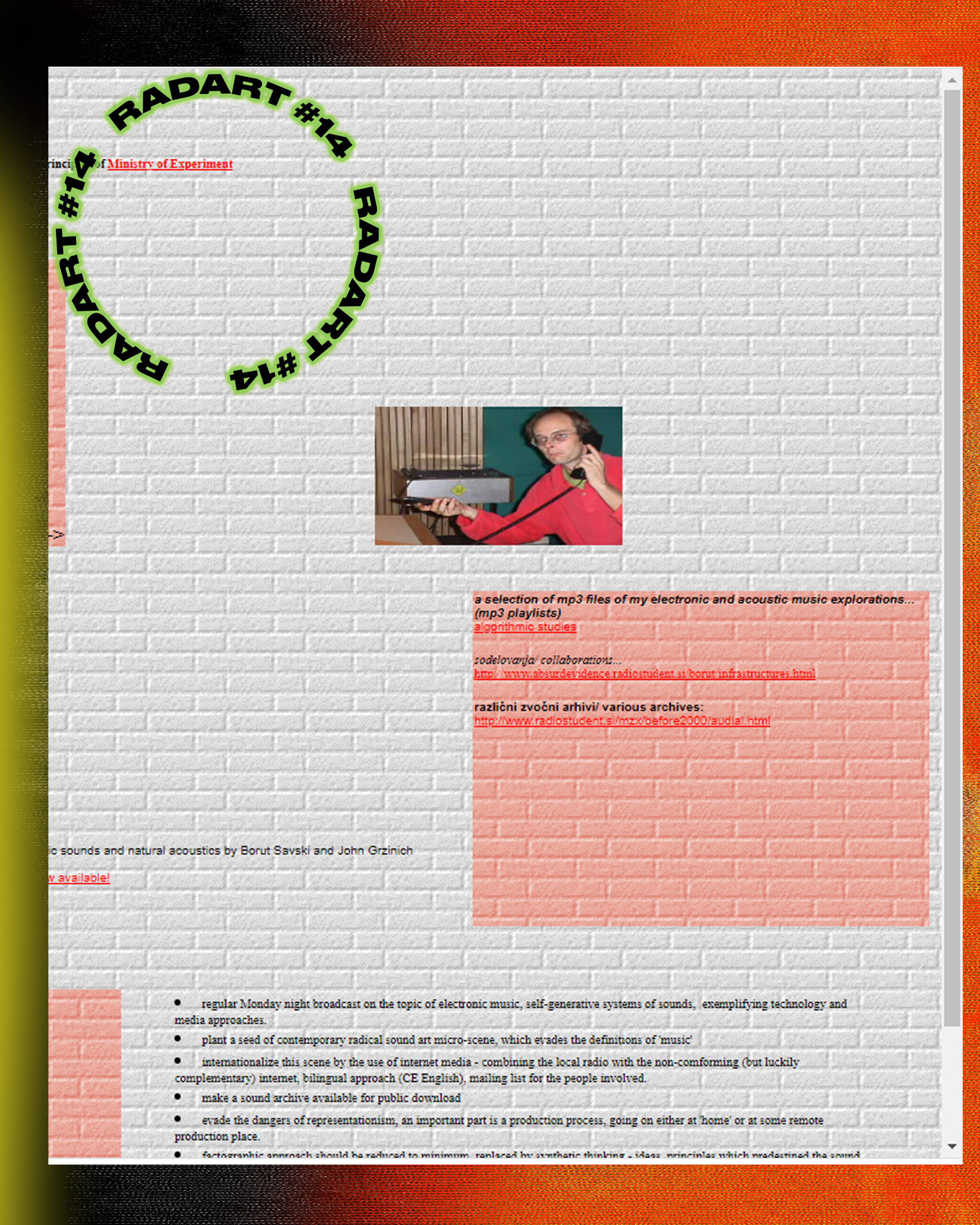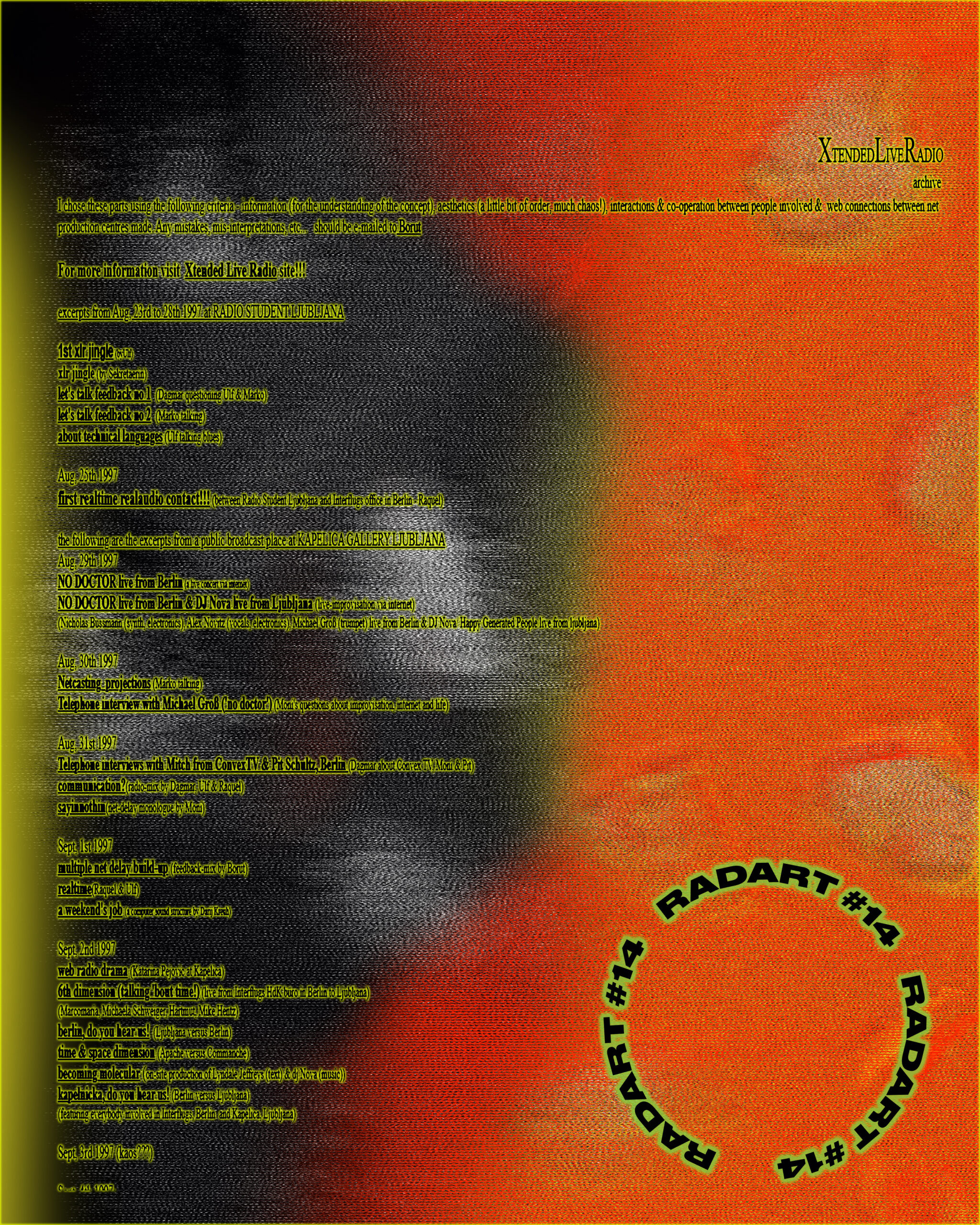 For this edition of Radia Network, Radio Študent is featuring an excerpt from live broadcast of the annual event Radart, which is organized by R A D A R – Open Radio (Art-Theory) Investigative Platform at Radio Študent in Ljubljana. The event took place on May 9th, coinciding with Radio Študent’s 54th anniversary.
