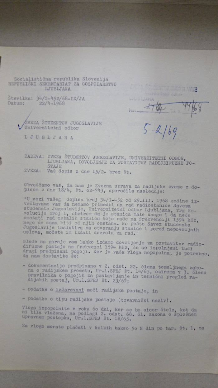 Poleg težav s sredstvi, kadri in posledično z napredkom izdelave same postaje, je začetek delovanja Radia Študent otežkočala tudi nepripravljenost oblasti strogo formalno omogočiti ali, bolje rečeno, odobriti umišljeno dejavnost radijskega oddajanja. Zvezna uprava za radijske zveze je namreč večkrat zavrnila prošnjo z zahtevo po odobritvi, obrazložitve teh pa so bile običajno precej pavšalne: navajano je na primer bilo, da je v mestu Ljubljana oziroma na celotnem teritoriju Socialistične republike Slovenije že tako preveč takšnih postaj, ustanovitev dodatne pa bi samo onemogočala delovanje obstoječih, ali pa da vsebinska potreba po takšnem radiu sploh ne obstaja, češ da že Radio Ljubljana I, Radio Ljubljana II ter vojaška frekvenca UKT FM omogočajo dovoljšno izbiro na tem območju.