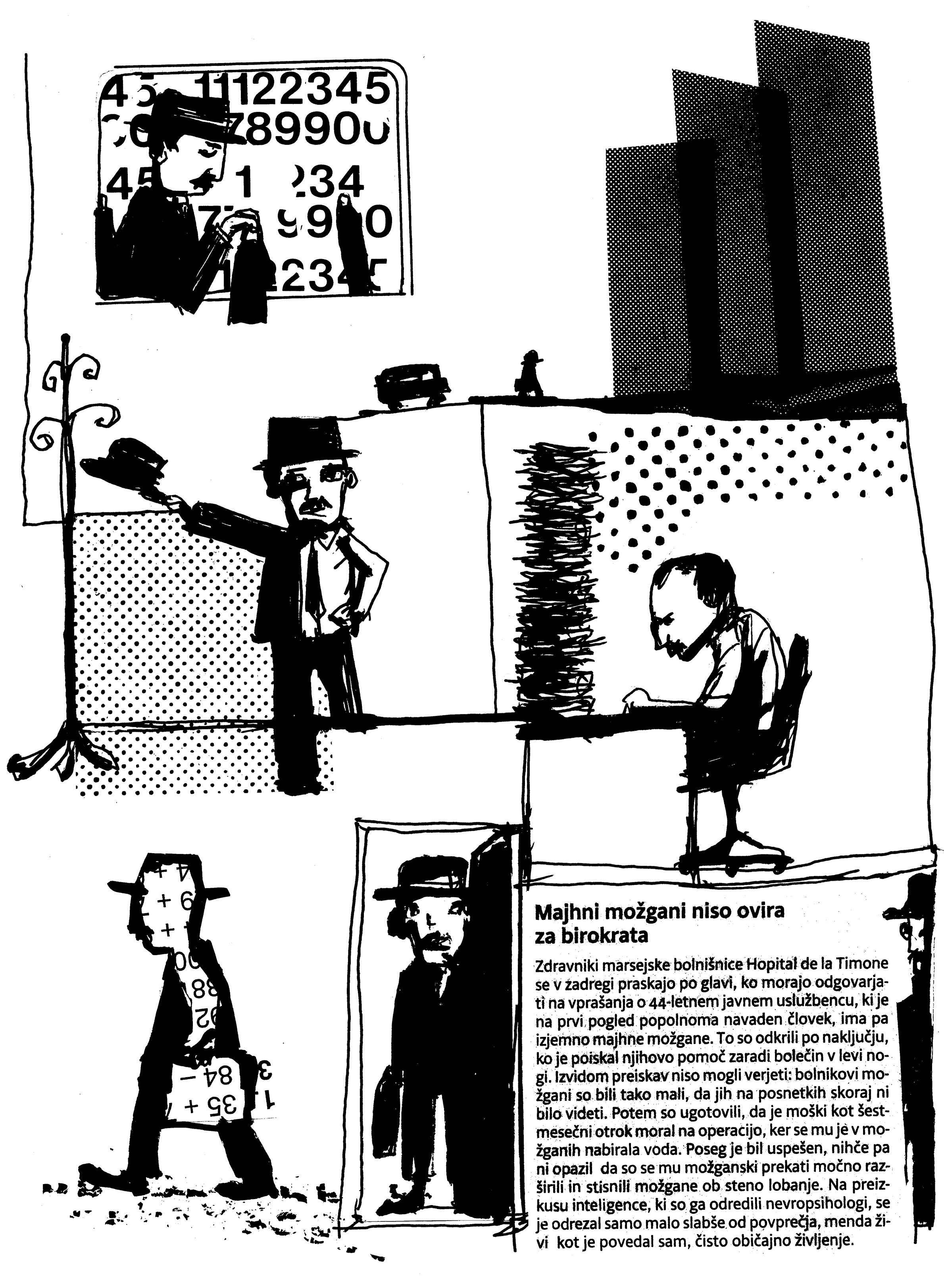 Govorimo lahko torej o reciklažnem stripu. Stripu, ki ga sestavljajo odpadni deli papirja, tako na podlagi kot v njenem izvoru. Črno beli tisk nam dimenzijo različnih tekstur in barv papirjev sicer delno uniči, pa vendar ravno dovolj, da se znajdemo v črno-beli simbiozi z nekaj sivimi odtenki. Vsak strip zaradi uporabe drugih materialov obstaja kot popolnoma nov svet. Na eni strani se srečamo z izrezki časopisnih člankov, skupaj z izrezki iz fotografij ali načrtov. Na drugi pa nas čakajo večinoma narisani deli, ki zgodbo iz časopisa predstavijo na inovativen način. Ta posledično kljub svoji nenavadnosti zlahka rezultira v kateri od novic, ki jih v stripu preberemo. Ob tako iz neba padlih zgodb si namreč verjetno tudi sami lahko narišemo vsaj še kakšno drugo predzgodbo.