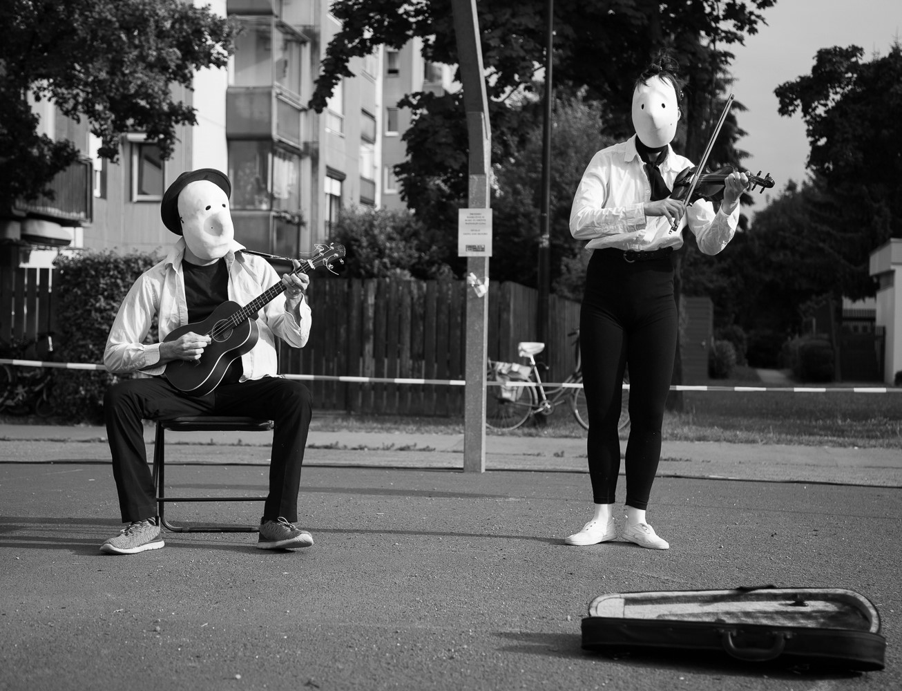 V delu v nastajanju Duo terasa sta Alenka Marinič in Justin Durel želela raziskati performativni potencial larvalnih mask, ki so sicer del študija tehnike fizičnega gledališča. Z maskami se performerji učijo izražati čustvena stanja in želje likov zgolj s telesnim izrazom - maska je kot lutka, ki jo igralec nosi na glavi. Larvalne maske, ki so izpeljane iz baselskih karnevalskih mask, še najbolj spominjajo na modernistične skice ali animirane filme zagrebške šole 50. in 60. let prejšnjega stoletja: iz abstraktne bele gmote lahko razberemo nos in dve luknji za oči, lik pa je reduciran na eno samo značajsko lastnost. Pred publiko prištorkljata dva lika v stiliziranih črno-belih kostumih - hitra in malce nervozna violinistka ter lenobni ostareli kitarist - in z omejenimi glasbenimi veščinami odšpilata tri komade. Pravzaprav se ne zgodi nič. Vseeno kot hipnotizirani opazujemo njuno okorno muziciranje, hecne tike, poglede in premore. Dobimo občutek, da smo padli v strip ali risanko dveh na hitro skiciranih modernističnih pojav. Neoprijemljivost dogajanja skupaj z dosledno utelesitvijo kreatur ustvari bizarni fiktivni svet, v katerega nam je dano pokukati za deset minut in v katerega bi nemara lahko bolščali še dlje. Po predstavi so se v pogovoru z avtorjema odprle različne možnosti nadaljnjega razvoja performativnega potenciala larvalnih mask, recimo poudariti kontrast med likoma, iz katerega se lahko porodijo konflikti in zgodba, ali pa poudariti interakcijo in omogočiti občinstvu vstop v drugo resničnost.