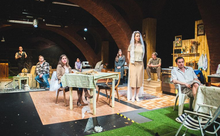 Poleg scenografije pa predstavi v prid deluje tudi umeščenost v spodnjo dvorano Slovenskega mladinskega gledališča. Ta z nizkimi opečnatimi oboki in poglobljenostjo odra na gledalko deluje ravno prav utesnjujoče; če se malce pesniško izrazimo, se v dogajanje ujamemo, kot sta v svojo tragično realnost ujeti protagonistki. Nelagodje, ki spremlja branje romana ‒ predvsem zaradi skoraj brezčutno objektivnega pripovedovanja o tako nesrečnih usodah ‒ poustvarijo tudi igralci in igralke. Že v prvem dejanju, s pogledi uperjenimi proti publiki, pričnejo s pripovedovanjem zgodbe. Vsak izmed njih tako odigra dvojno vlogo pripovedovalke in lika.