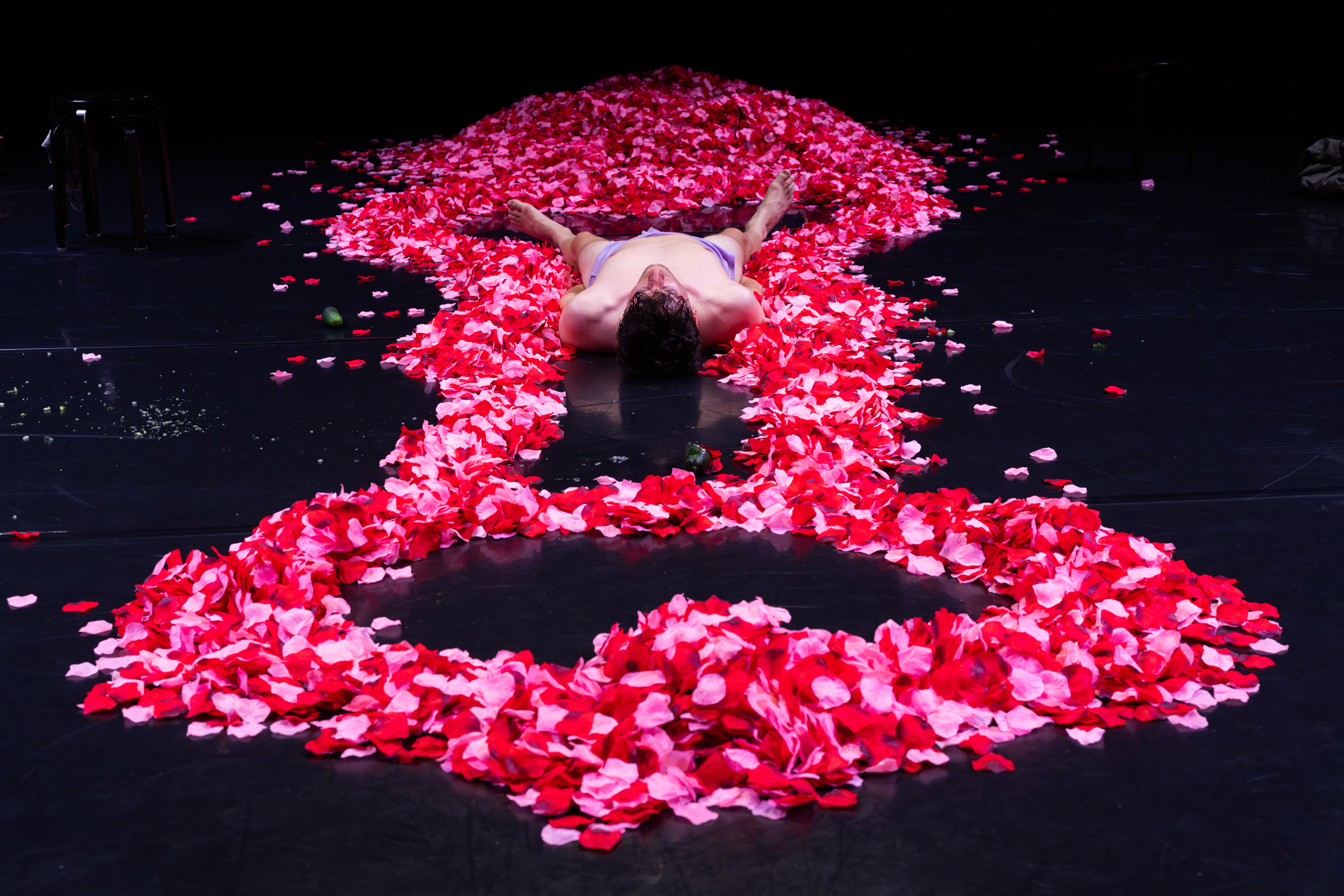 Rez. Luči se zamenjajo in pred nami je skoraj filmska scena. Osvobajanje. Epilog. Umetnik se uleže v kup umetnih cvetnih listov vrtnice. Iz tega kupa začne delati oblike, vsakemu gledalcu se zazdi, da bo oblikoval veliko srce, ampak ne, oblikuje en velik penis in se vanj zakoplje, plava v njem in počiva.