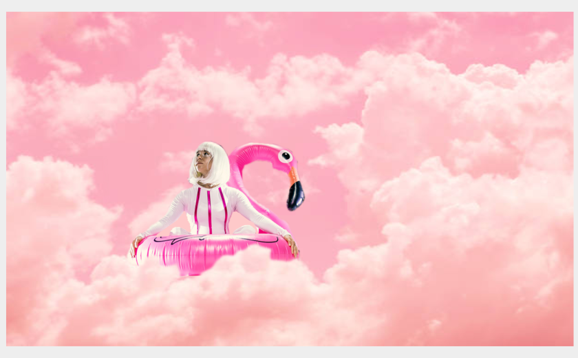 Ko smo se začeli pomikati proti svojim sediščem, je Romih že sedela sredi odra, pogreznjena v napol prazen rožnati obroč, evidentno smo jo ujeli med napihovanjem blazine v obliki flaminga. Oblečena je v belo-rožnat kostum, ki še najbolj spominja na rožnato power rangerko z belo sintetično lasuljo. Ko se gledalci posedemo, se luči malce zatemnijo, kar nam da signal, naj potihnemo. V tem trenutku se lahko zatopimo v svetleče rožnate oblačke, ki so projicirani v ozadje odra in v kombinaciji z izgledom performerke ustvarjajo alternativen svet pinky atmosfere, eteričnega vzdušja in polivinilklorida. Vzdušje lebdenja v nadzemskem svetu lahkotnosti še podkrepljuje umirjena zvočna podlaga počasnih ritmov. Vse nas nagovarja k temu, da se sprostimo. Ko plesalka svojega odrskega partnerja napolni z izdihanim zrakom, se z nasmeškom obrne proti občinstvu, nakar zaslišimo glas izjemno artikulirane performerke, ki okuša vsak fonem posebej. Povabi nas, da zapremo oči in se ji pridružimo v sproščanju: Vdihnite in izdihnite. Vdihnite igrivost in izdihnite tegobe, od danes, od gneče na cesti, od politike, od pred parih let. Idiosinkrazija igralkinega glasu do predstavljenega vizualnega materiala v gledalcih hitro vzpostavi ironično distanco, češ: vem, da izgleda kot konvencionalne dihalne vaje, ampak vztrajajmo še malo.