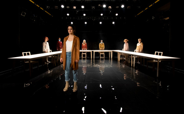 Nedoločnosti časa in prostora igre sledi tudi scena, ki jo preoblikujejo igralci sami. Mize zdaj predstavljajo institucionalno konferenčno dvorano, zdaj simbolno grmado. Na vrhuncu predstave lepa Vida na njej sicer ne zgori, temveč skoraj konča na dnu reke, v katero skoči kar sama od sebe – hura za emancipacijo! Reka oziroma bazen sicer služi predvsem estetskemu učinku – do izraza namreč najbolj pride ob plesu, ki tudi sam nima jasne funkcije.