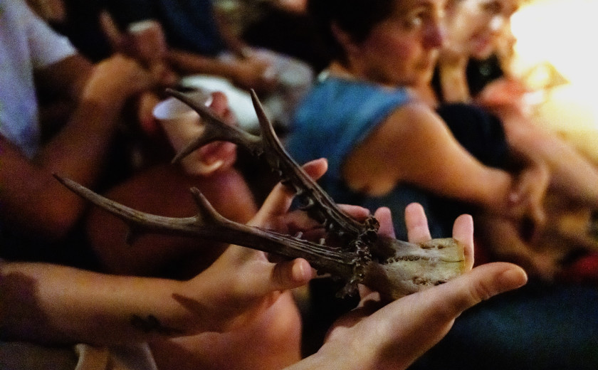 Večplastnost obstoja – kjer je človek lahko hkrati voznik in oče – je jedro Poslednje noči jelena, ki mu ne ubeži niti občinstvo. Gledalci smo med predstavo nagovorjeni kot animistični duhovi gozda. Pot jelena zarišemo z jelenjo lobanjo, ki si jo podajamo med sabo. Nekdo izmed občinstva pa prevzame vlogo povoženega jelena, ki je posvečeno poseden na nekakšnem primitivnem oltarju. Gledalci smo žalovalci, ki dvignemo kozarec padlemu jelenu – in smo tudi drevesa, ki obrnejo hrbet človekoma v avtu.