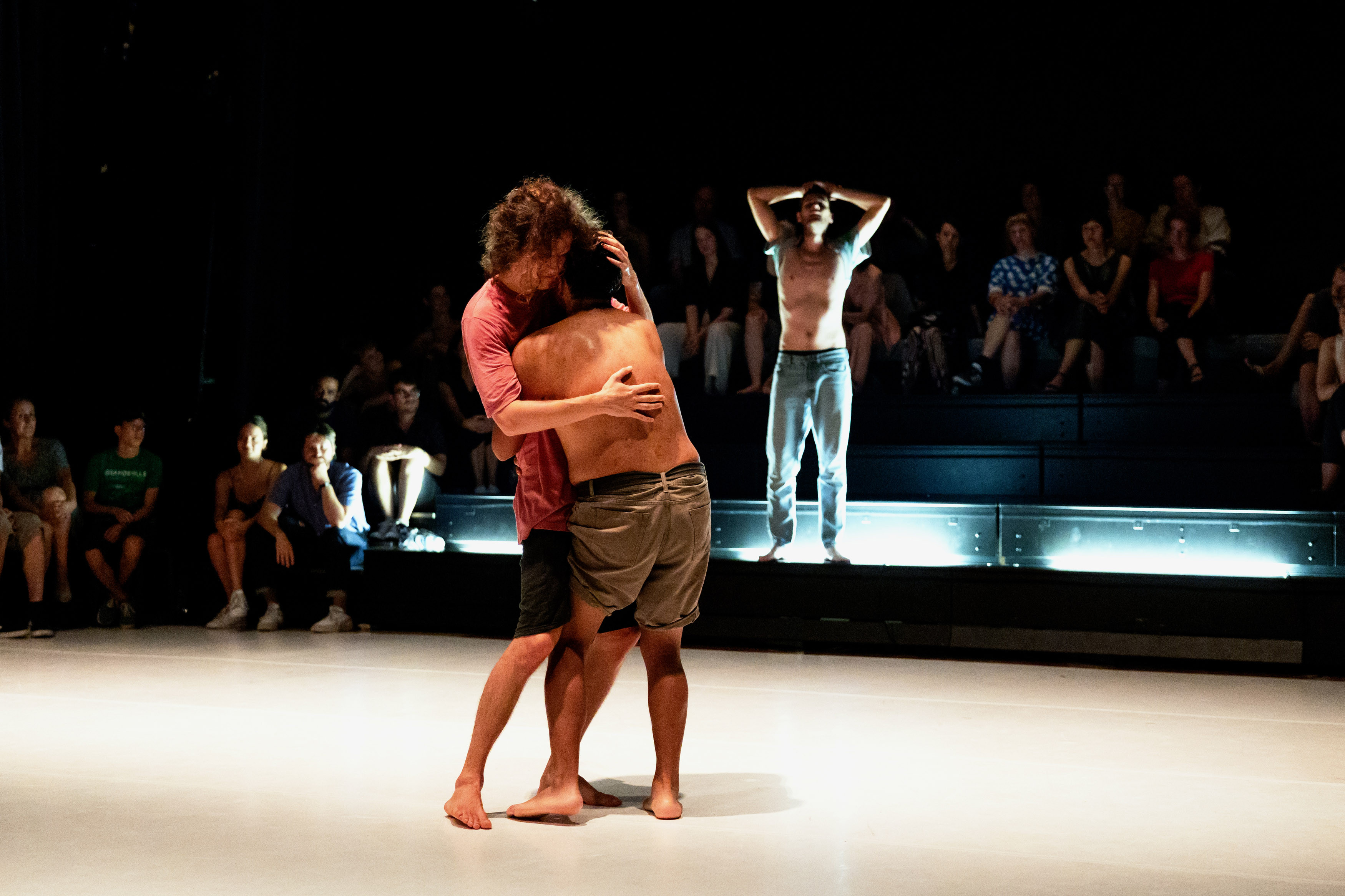 Do te točke si se, draga poslušalka, grizla in tepla z nadležno ponavljajočim se tekstom, ki se je vrtel okrog enega besednega korena in vsake toliko pobožal s kakšno šalo. V tvojih možganih se nemara poraja prijeten konflikt odzivov na prebrano, ki te hkrati frustrira in (upam) vsaj malo vznemirja. Da bi se zadeli, so performerji ubrali prav takšno strategijo: pendulum moškosti, ki je navadno zataknjen v nebrzdani agresiji, z vso močjo zanihajo v silovito nežnost in spet nazaj. Zaletavajo se eden v drugega. Podirajo se po tleh, kjer obležijo v objemu. Sledi poljub na čelo. Poljubu sledi ugriz v uho. Skoraj senzualen izdih zadovoljstva preseka krik bolečine. V tišini dvorane nas doseže vsako drgnenje kože in godrnjanje, ki bi ga lahko pripisali tako užitku kot naporu. Neizrečene, a vsem nekako jasne meje, ki v moških slačilnicah udarce po riti in izzivalno šlatanje opredeljujejo kot 'ne gej', so popolnoma izbrisane.