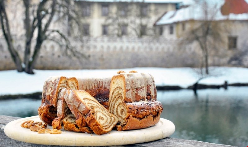 Pšenična moka, kravje mleko, polnomastna skuta, orehova jedrca, vanilja, pehtran, domači rum, kokošja jajca, kravje maslo, sladkor, rozine, kisla in sladka smetana, cimet, sol in kvas.