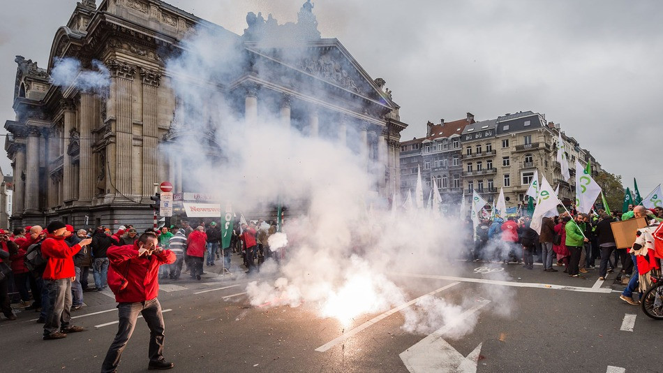 Belgijske ulice so se včeraj znašle pod pritiskom teže protestnikov, v eni največjih demonstracij od konca druge svetovne vojne. Razlog za protest je za naše, tako imenovane moderne čase že skoraj tradicionalen, in sicer nestrinjanje z varčevalnimi ukrepi, ki nažirajo belgijsko socialno državo. Po dveh urah je, tudi že tradicionalno, prišlo do spopadov s policijo, ki se je protestnikov lotila z vodnimi topovi in solzivcem.