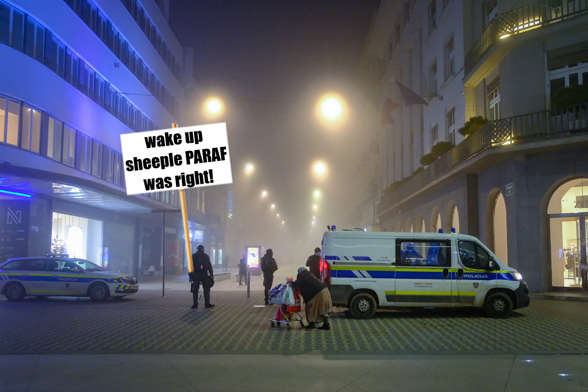 Nič od tega se ni udejanjilo, tako da so morali policaji odvečno energijo izživeti na naključnih mimoidočih; poleg avtorice uvodnega nagovora so po pričevanjih očividcev v središču slovenske prestolnice z uporabo prisilnih sredstev aretirali vsaj še dva mladeniča. Vendar se ne bomo zanašali na očividce. Včerajšnje policijsko popoldne so na Policijski upravi Ljubljana strnili v naslednje povedi: