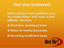 Kljub temu da iz Inšpektorata za delo preko svetovnega spleta na Slovenskem zaednkrat še zaposlenim nadalje sporočajo, da te ukrepe delodajalca ob vročih dneh razvrščamo na tri osnovne vsebinske sklope: organizacijske, tehnične in preventivne; so ti ukrepi po posameznih sklopih ponovno popisani kar se le da vsebinsko ohlapno. Tako med organizacijske ukrepe na primer spadajo: prerazporeditev delovnega časa, krajši delovni čas, pogostejši in daljši odmori med delovnim časom, ponudba ustreznih osvežilnih brezalkoholnih napitkov, zmanjšanje intenzivnosti dela in podobno. Kot skrajni ukrep pa je na Slovenskem delodajalcu dopuščena in ponujena tudi možnost prekinitve delovnega procesa.