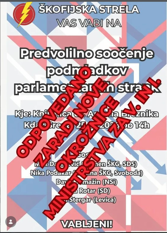 Prav danes naj bi na Škofijski klasični gimnaziji v Šentvidu v Ljubljani potekalo predvolilno soočenje podmladkov trenutno še parlamentarnih strank, ki so se ga tako kot pred državnozborskimi volitvami leta 2022 in pred volitvami v Evropski parlament leta 2024 namenili organizirati dijaki iz družbenopolitičnega krožka Škofijska strela, a ga ne bo, ker da je v navzkrižju z 72. členom zakona o organizaciji in financiranju vzgoje in izobraževanja, ki med drugim v vrtcih in šolah prepoveduje delovanje tako političnih strank kot njihovih podmladkov, in ker ga je ministrstvo za vzgojo in izobraževanje pod vodstvom doktorja Vinka Logaja iz Gibanja Svoboda za vsak primer in ne glede na to, da smo sredi uradne predvolilne kampanje, v tej in vseh drugih šolah preprosto prepovedalo.