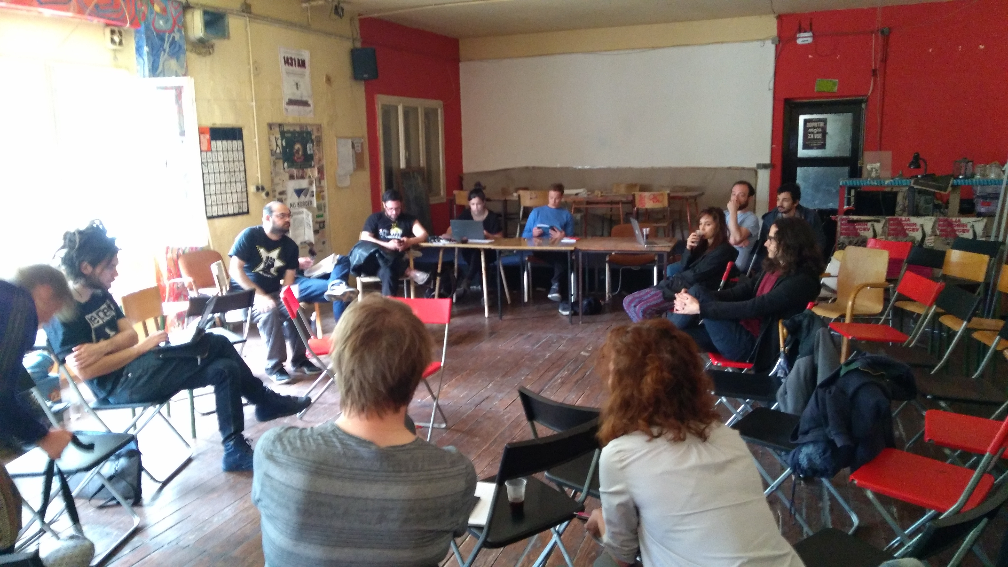 Dopoldanska delavnica z naslovom Svoboda gibanja in pravica do bivanja je potekla v prostorih kolektiva Živko Skvotec. Po krajši zamudi se je trideset ali štirideset glava skupina aktivistov iz različnih držav zbrala in sledile so različno dolge predstavitve lokalnih in nacionalno specifičnih razmer, v katerih delujejo člani na konferenci zbranih organizacij. Moč je bilo slišati kako poteka delo nevladnih organizacij in različnih kolektivov aktivnih na področju migracij v Makedoniji, Srbiji, Madžarski, Italiji in Švedski.