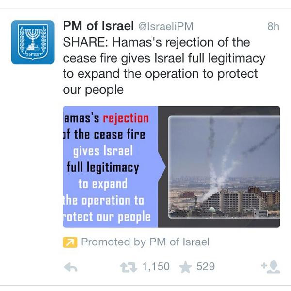 Izraelsko-palestinski konflikt pa se ne bojuje le na vojaških frontah. Vojna že dolgo ni več omejena na bojevanje v zraku, vodi in na kopnem, kar dokazuje tudi najnovejša poteza izraelskega vladnega kabineta. Izrael je namreč na socialnem omrežju Twitter sprožil medijsko kampanjo v podporo svoji operaciji na okupiranem območju Gaze. Tviti njihovega vladnega kabineta so poudarjeni, nosijo pa, razumljivo, zelo odkrito propagandno noto. Prav tako se je za podobno akcijo prepričevanja ljudi in dvigovanja javnega mnenja, imenovano What would you do?, odločilo izraelsko obrambno ministrstvo.