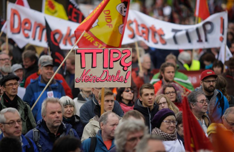 V Hanovru se je v soboto zbralo več deset tisoč ljudi, ki nasprotujejo transatlantskemu trgovinsko-investicijskemu sporazumu TTIP, ki ščiti interese korporacij in jim med drugim z mehanizmom Investment Court System podeljuje moč, da spodbijajo državno zakonodajo v primeru ogroženih dobičkov. Pogajanja o TTIP danes začenjajo svoj trinajsti krog, ameriški predsednik Barack Obama pa želi, da se sporazum sklene še v času njegovega predsednikovanja, torej do konca leta. V ta namen naj bi tudi v petek pozival Britance, naj na junijskem referendumu ne glasujejo za brexit, in zagrozil, da bi sicer usklajevanje trgovinskega sporazuma za Veliko Britanijo lahko trajalo tudi deset let. Okrog 200 protestnikov se je zbralo tudi naslednji dan, ko je Obama v Hanovru slovesno otvoril veliki industrijsko-trgovinski sejem, s katerim bi mnogim ameriškim podjetjem odprl možnost vstopa na nove trge.