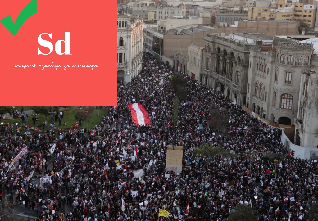 Začasni perujski predsednik Manuel Merino je odstopil po petih dnevih opravljanja funkcije, kongres pa naslednika še ni določil. Odstop je sledil policijskemu nasilju na prodemokratičnih proti-Merino protestih, ki trajajo že teden dni, ubita pa sta bila vsaj dva protestnika. Med miroljubnim shodom so bili uporabljeni vodni top, solzivec ter gumijasti naboji, manjkala pa nista niti ugašanje uličnih svetilk in blokada mobilnih telefonov. Merino trdi, da je ob sprejetju predsedništva deloval v skladu z zakonom, potem ko je parlament prejšnjemu predsedniku Martinu Vizcarri izglasoval nezaupnico. Merina protestniki obtožujejo, da je izvedel državni udar. Podobno je poskušal storiti že septembra, a mu ni uspelo dobiti dovolj glasov. Z uporabo arhaičnih zakonov o moralni neoporečnosti so Vizcarri očitali sprejemanje podkupnin in s tem nezmožnost predsedovanja, s čimer se je strinjalo 105 od 130 poslancev. Več kot polovica jih je v kazenskih postopkih, naj bo zaradi korupcije ali umora, Vizcarra pa je želel ukiniti poslansko imuniteto.