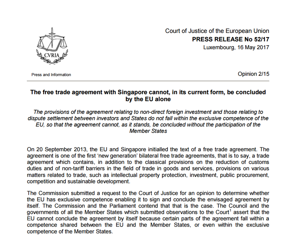 Sodišče Evropske unije je presodilo, da Evropska komisija sama ne more sprejeti prostotrgovinskega sporazuma med EU in Singapurjem, pač pa bo za to potrebna ratifikacija vseh 38 nacionalnih in regionalnih parlamentov v evropski osemindvajseterici.